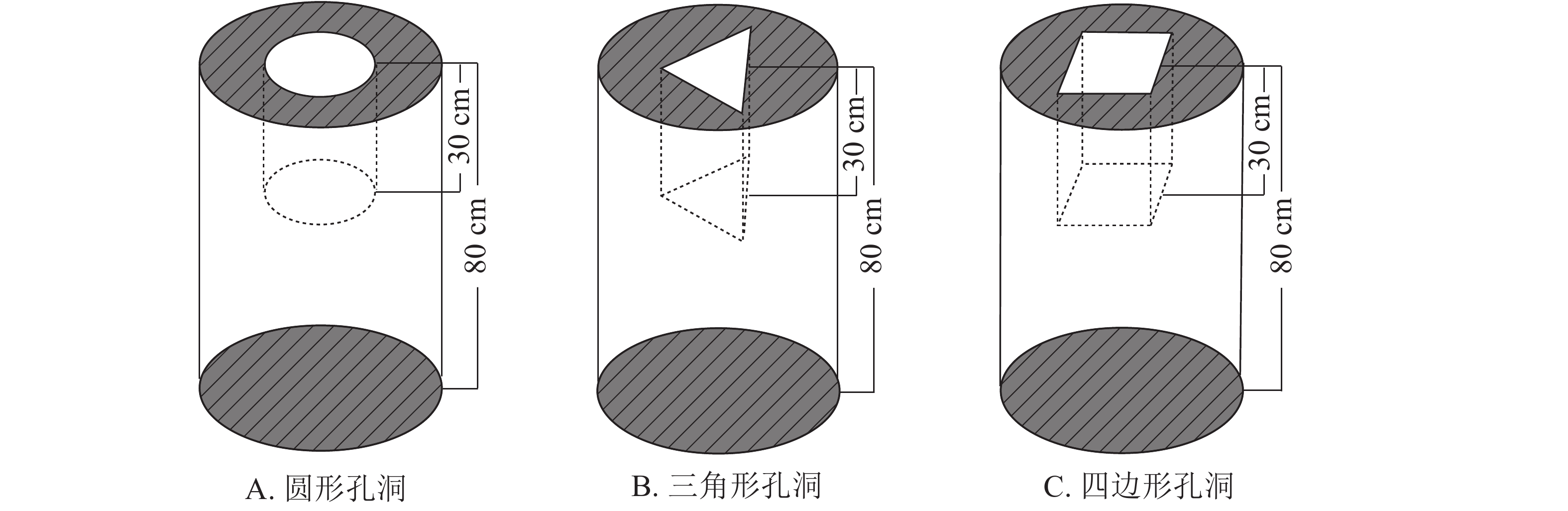 马尾松和杉木原木伐倒后,自树根位置80 cm起按每段长约80 cm逐个截取木段,以模拟短柱;截断后的部分木段通风干燥3 a,使其达到北京地区的平衡含水率。对干燥后的木段进行挑选并分别编号为S1、S2、S3、S4、S5、S6和C1用于实验研究,每个木段标记其起始检测点,其中S1~S6为马尾松试件,C1为杉木试件。取S2、S3、S4木段在其内部加工大小不一致的圆形孔洞;取S5木段在其内部加工三角形孔洞;取S6木段在其内部加工四边形孔洞;取C1木段在其内部加工圆形孔洞;S1为备用木段。以上木段的孔洞加工均位于中心位置,孔洞深度约30 cm(图1)。