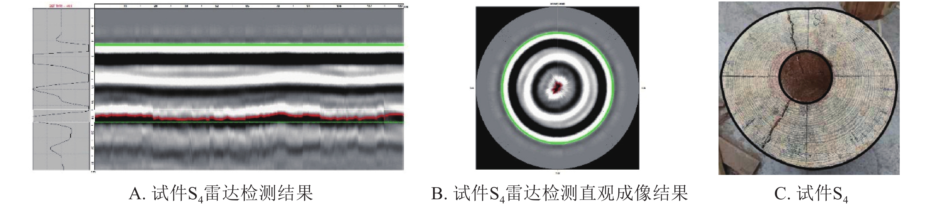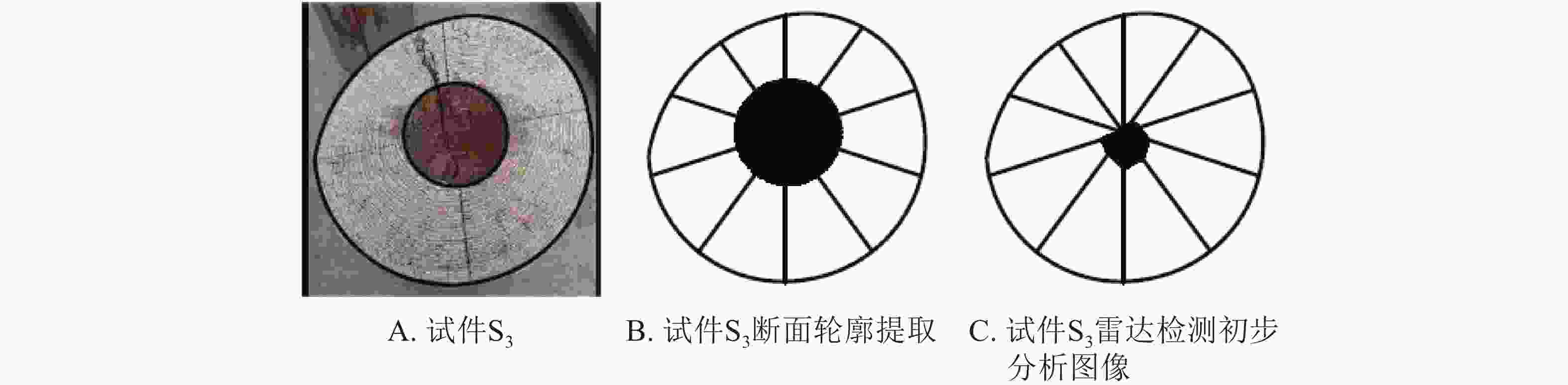 采用树木雷达对上述试材进行雷达扫描[13],其中S3、S4、S5、S6为试验用材,S2和C1为数据分析验证试材。本次测试研究采用美国树木雷达检测系统[Tree Radar Unit(TRU)],主要参数设置为:频率900 MHz,最大扫描直径4.2 m,深度分辨率1.9 mm,数据采集间隔5 mm。