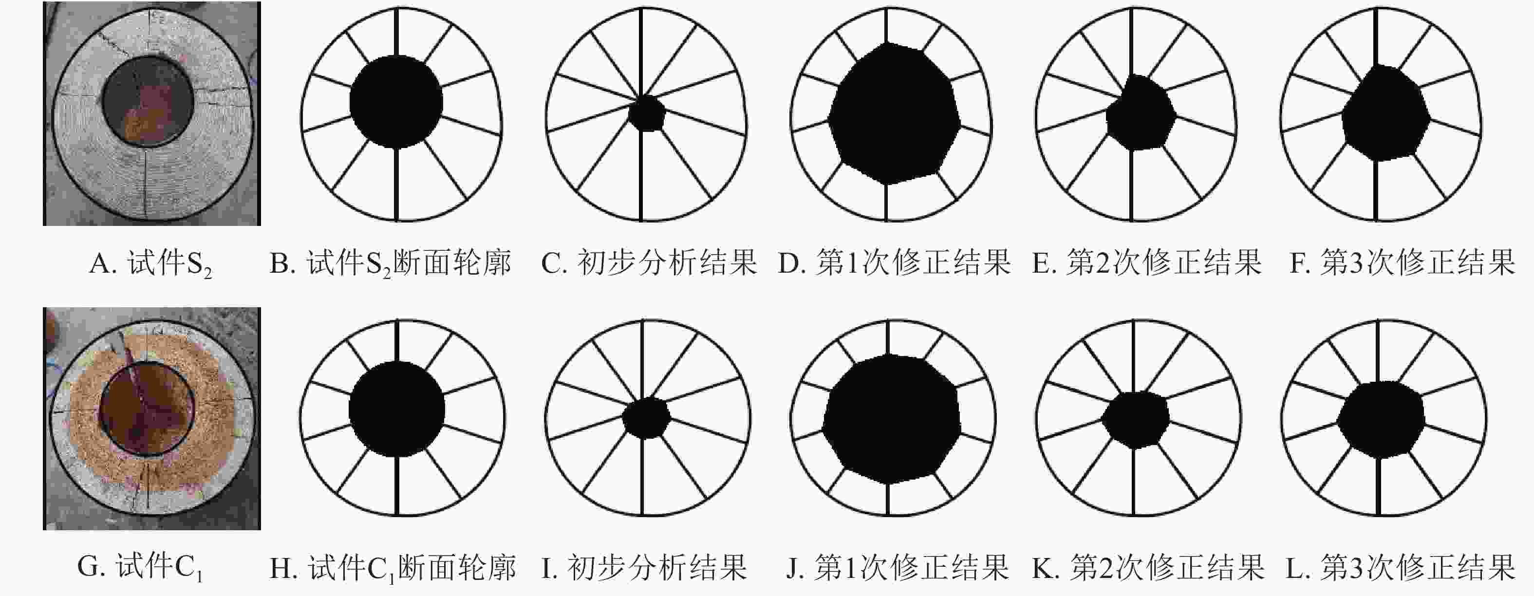 为验证上述结论,本研究选取了具有不同大小孔洞马尾松试材S2和杉木试材C1进行补充试验,并根据上述研究步骤获取其断面轮廓、雷达检测初步结果、第1次修正结果、第2次修正结果和第3次修正结果,经数据整理见图6。