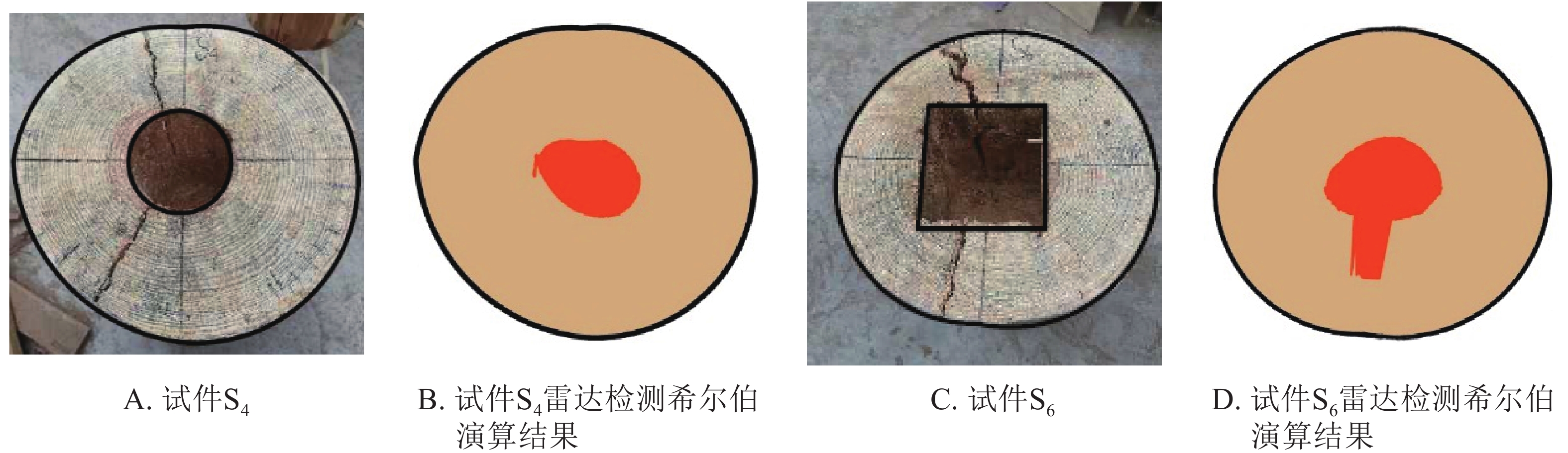 序号 孔洞类型 实际孔洞百分比/% 雷达测算孔洞百分比/% S3 圆形孔洞 14.67 2.15 S4 圆形孔洞 9.66 0.84 S5 三角形孔洞 12.82 1.59 S6 四边形孔洞 20.26 2.53 从表1和图4可以看出:通过雷达检测可以快速判定木材内部孔洞的存在,但其预估的孔洞面积与实际面积相差较大。这主要是因为雷达检测内部孔洞的轮廓线产生了一定的偏移,且实际检测对象的介电常数与预设常数相差较大,导致预估孔洞面积与实际孔洞面积相差甚远。从表1和图4结果也可以看出:雷达检测预估内部孔洞面积若不加以修正,其数值远小于实际孔洞面积,无法直接应用于古建筑木构件内部残损的定量评估。
