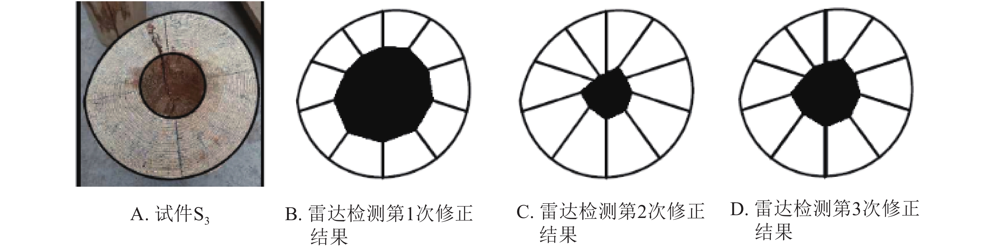 $ v=\dfrac{c}{\sqrt{{\rm{\varepsilon }}}} $ ,其中:c为雷达波在真空中的传播速度;ε为介质的介电常数[15]。由此,木材边缘与孔洞边缘的距离可以简化为$ s=\dfrac{{\rm{c}}t}{2\sqrt{{\rm{\varepsilon }}}} $ ,其中:t为雷达波传播时间。假设“钻孔”操作中木材边缘与孔洞边缘的距离为sr,实测偏移量为a,则雷达检测中木材边缘与孔洞边缘距离第1次修正为s1c=sr−a。同时,根据雷达检测系统预设介电常数ε1和马尾松木材介电常数ε2[16-17],设定介电常数修正系数为$ {k}_{1}=\dfrac{\sqrt{{{\rm{\varepsilon }}}_{1}}}{\sqrt{{{\rm{\varepsilon }}}_{2}}} $ ,则雷达检测中木材边缘与孔洞边缘距离第2次修正为s2c=(sr−a)k1。以试件S3为例,修正结果见图5。图5A为试件S3;图5B为根据偏移量进行第1次修正后的孔洞图像;图5C为根据介电常数进行第2次修正后的孔洞图像;图5D为3次修正后的孔洞图像。为了便于分析,同样对试件S3、S4、S5、S6的雷达检测数据修正结果进行了计算和统计。从表2和图5可以看出:根据偏移量进行第1次修正后,识别精度得到一定得提升,但其与实际孔洞相比均表现为偏大,这主要是因为修正距离s1c是根据雷达检测系统预设介电常数ε1计算得来,但实际检测对象的介电常数为ε2,在气干木材的检测中预设介电常数ε1大于检测对象介电常数ε2,故而s1c距离偏小,导致孔洞识别偏大。从表2和图5也可以看出:根据介电常数进行第2次修正后,其检测修正面积与实际孔洞面积仍存在一定偏差。从图5也可以看出:无论是否修正,雷达识别孔洞形状的能力均较差,这可能是因为外部形状等因素引起了内部图像的扭曲。