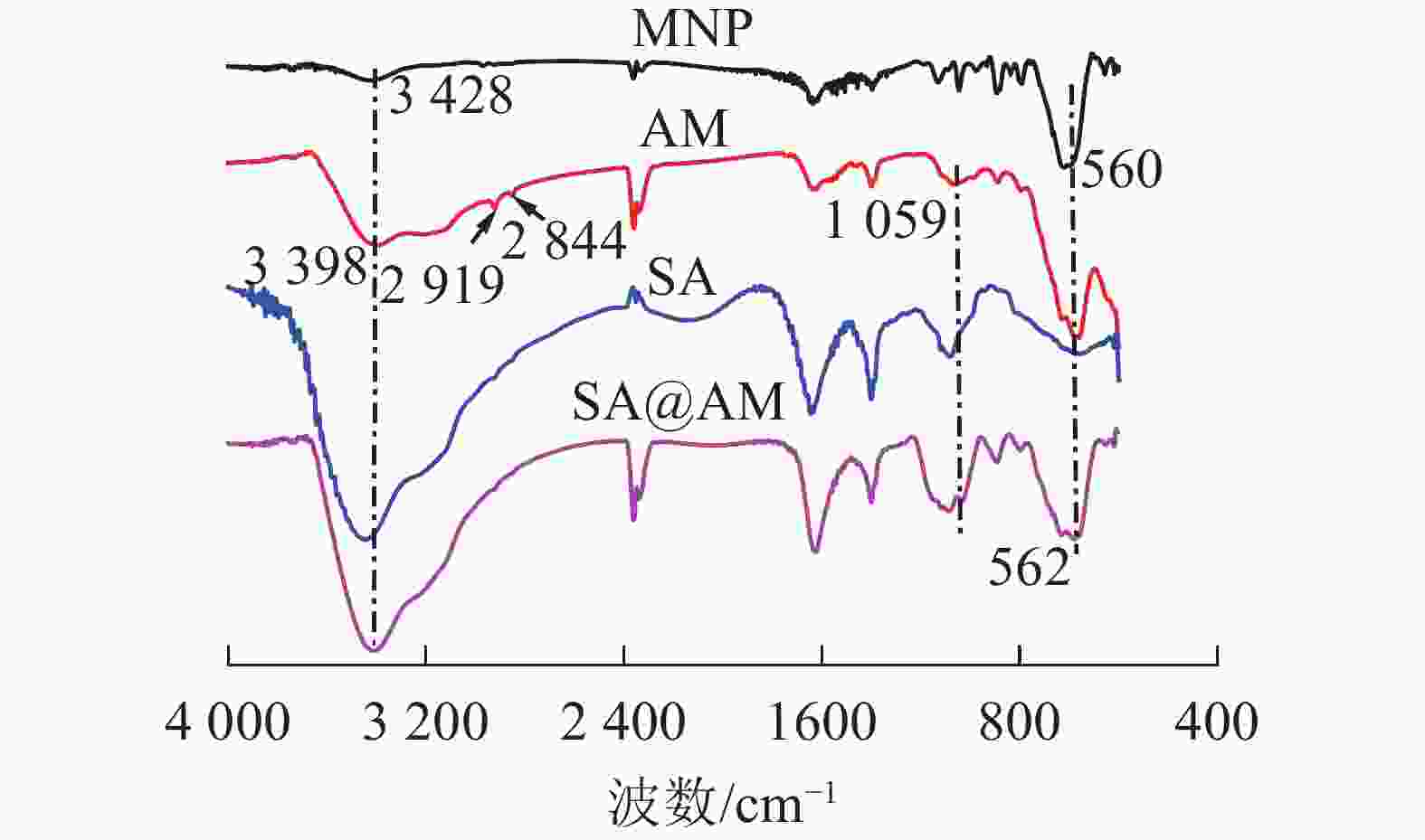 由图1可知:在560 cm−1的吸收峰归属于纳米磁性粒子Fe3O4(MNP)的Fe—O伸缩振动峰,3 428 cm−1的吸收峰归属于Fe3O4的—OH的伸缩振动峰[11]。与MNP的红外光谱相比可知:在3 398 cm−1的吸收峰归属于端氨基AM的N—H伸缩振动峰;亚甲基的对称和不对称伸缩振动峰归属于2 919和2 844 cm−1的吸收峰[12];Si—O—C的伸缩振动吸收峰在1 059 cm−1处显现,Fe3O4中Fe—O键的特征吸收峰在560 cm−1出现。比较产物MNP、AM、SA@AM的红外谱可知:在N—H伸缩振动峰归属于3 397 cm−1的吸收峰;制备的产物AM、SA@AM都含有Fe3O4中Fe—O键的特征吸收峰562 cm−1。综上分析可得:图谱所表示的特征峰基本与产物的结构相一致,可以判定目标产物的成功制备。