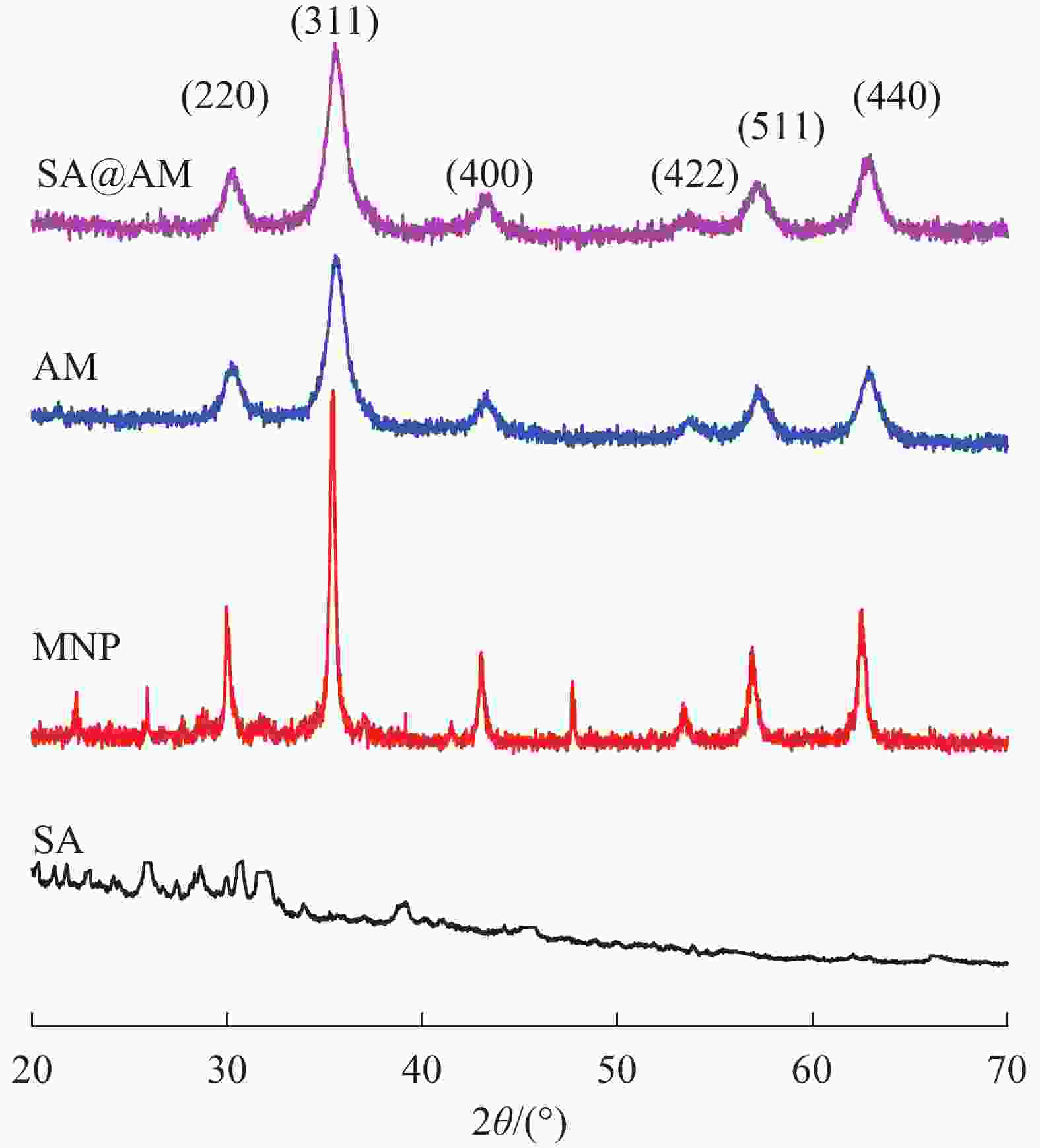 NMR结构分析是产物表征常用的有效方法。由于强磁材料的特殊性干扰核磁场强,无法获得较为准确核磁谱图,因此,利用元素分析结合X射线衍射仪(XRD)等表征方法对材料结构进行分析。由表1可知:各样品中均可以检测出碳、硅、氧、氮、铁等元素。MNP经硅烷化反应制备得到的富含端氨基AM,AM中氮和硅的质量分数(4.72%和4.98%)有所增加。氨基改性的AM被包覆在SA@AM中,SA@AM与磁性粒子MNP、AM相比,其碳、氧元素的质量分数增加,硅、氮、铁元素的质量分数减少,SA@AM的组成特征与分析结果相符合。综上所述,元素分析质量分数检测结果与产物实际特征相符合,进一步验证了预期产物的成功合成。
