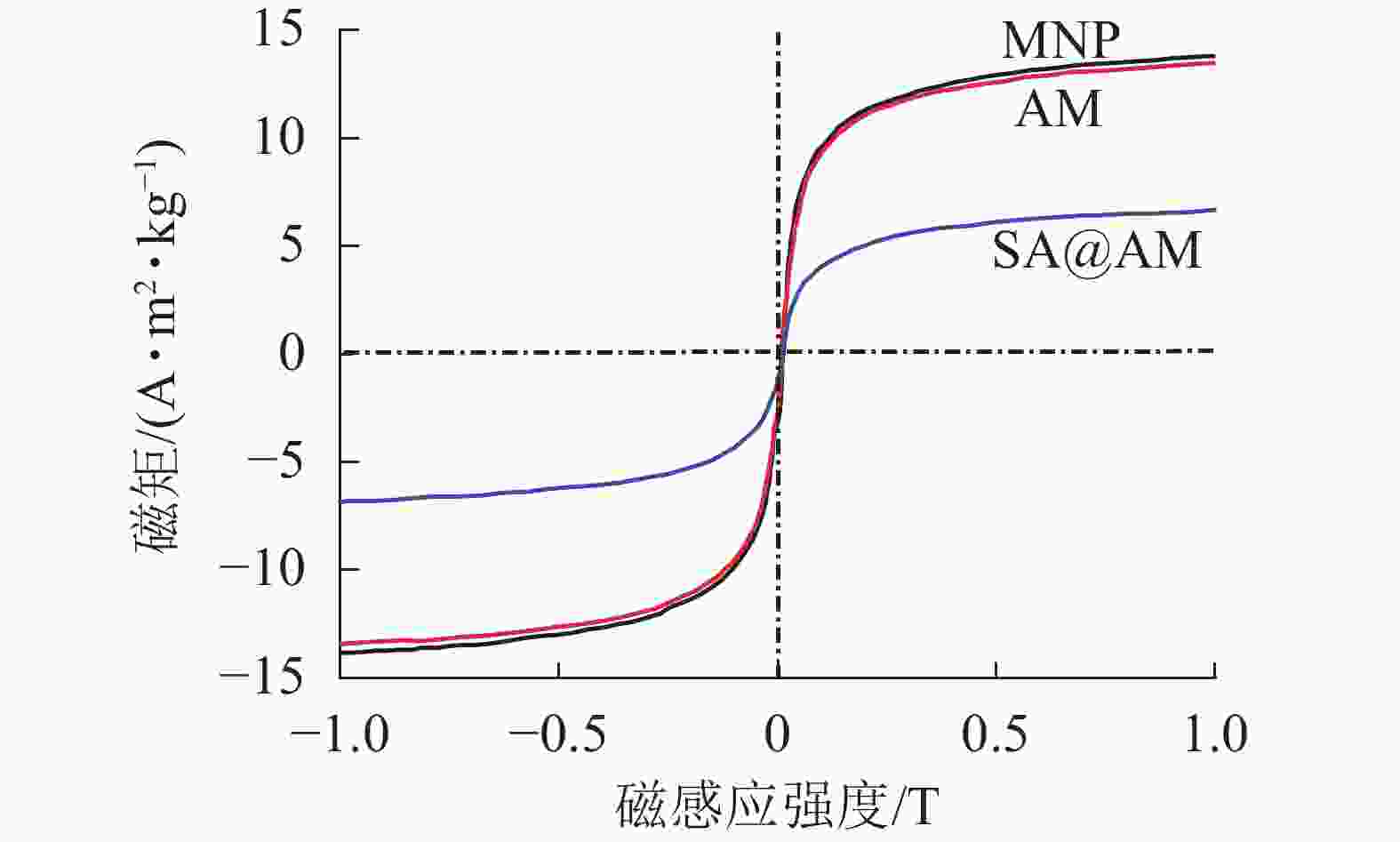 原始产物MNP、AM和终产物SA@AM的VSM分析磁化曲线如图4所示。产物的磁场饱和强度采用磁强度计进行测定[16]。在300 K、外部磁场为−1~1 T条件下,各产物几乎无剩磁产生,因为其磁滞曲线为S型而且过原点,同时矫顽力和剩余磁场强度都接近0[17],表明所制备的MNP、AM和SA@AM具有超顺磁性而且有良好的磁力响应性能[18]。测试的结果表示:MNP、AM和SA@AM的磁化值分别为13.8、13.4和6.85 A·m2·kg−1,SA@AM比MNP和AM的磁化值高。粒子表面被硅烷官能团覆盖可能影响产物AM的磁化值,这或许是AM的磁性比MNP稍低的原因。AM被海藻酸钠包覆影响SA@AM的磁化性能,造成其磁性减弱。
