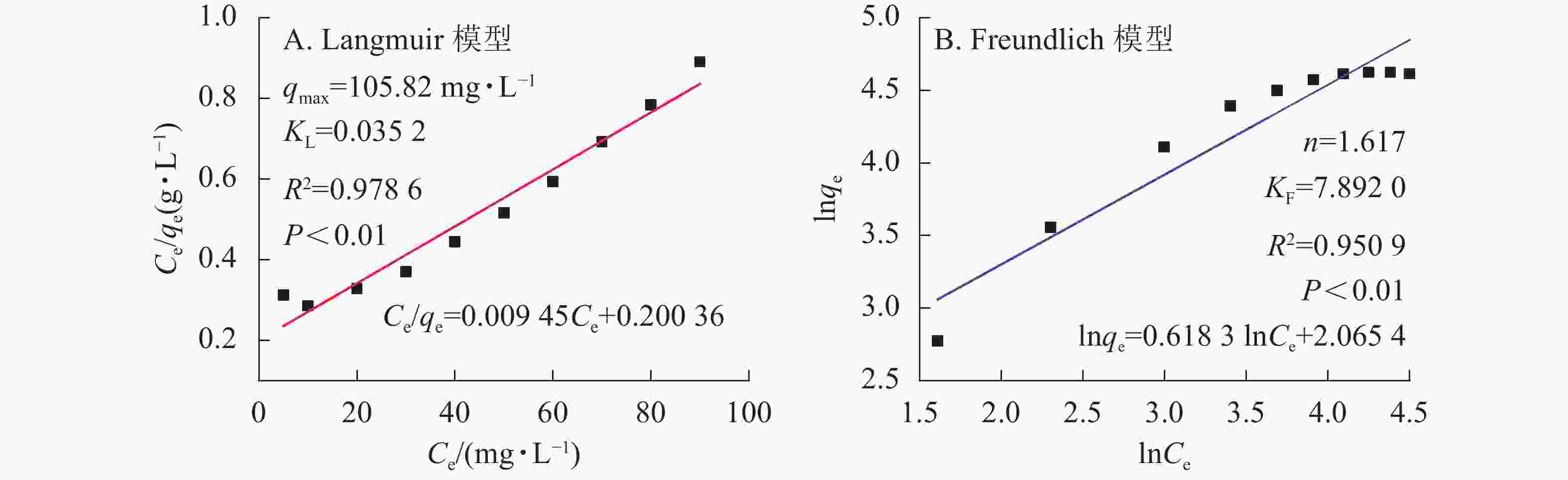 $$ \ln q_{\mathrm{e}}=\ln K_{\mathrm{F}}+\frac{1}{n} \ln C_{\rm{e}}^{\prime} \text{;} $$ (2) $$ \frac{C_{\rm{e}}^{\prime}}{q_{\rm{e}}}=\frac{C_{\rm{e}}^{\prime}}{q_{\rm{max }}}+\frac{1}{q_{\rm{max }} K_{\rm{L}}}\text{。} $$ (3) 式(2)和式(3)中: