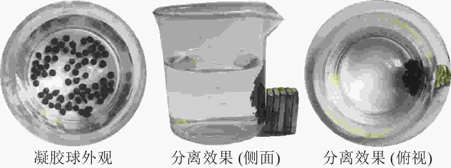 在200 mL甲醇中加入上述制备得到的MNP,搅拌分散。加入10 mL APTS,氮气(N2)保护下(60 ℃)回流搅拌12 h。甲醇洗涤数次,得到端氨基修饰磁性颗粒(AM),磁力法分离产物,储存在甲醇溶液中备用。参考文献[7],取20 mL 10 g·kg−1海藻酸钠溶液在烧杯中,加入氨基修饰AM,搅拌混合后超声波处理30 min;配置20 g·kg−1氯化钙溶液,将混合悬浮液缓慢匀速滴入其中。悬浮液在水中发生交联形成颜色偏黑、粒度均匀的复合磁性凝胶球。凝胶球在CaCl2溶液中充分浸泡48 h后,用超纯水洗涤数次,即得新型磁性海藻酸钠复合凝胶球(SA@AM)。冻干备用。