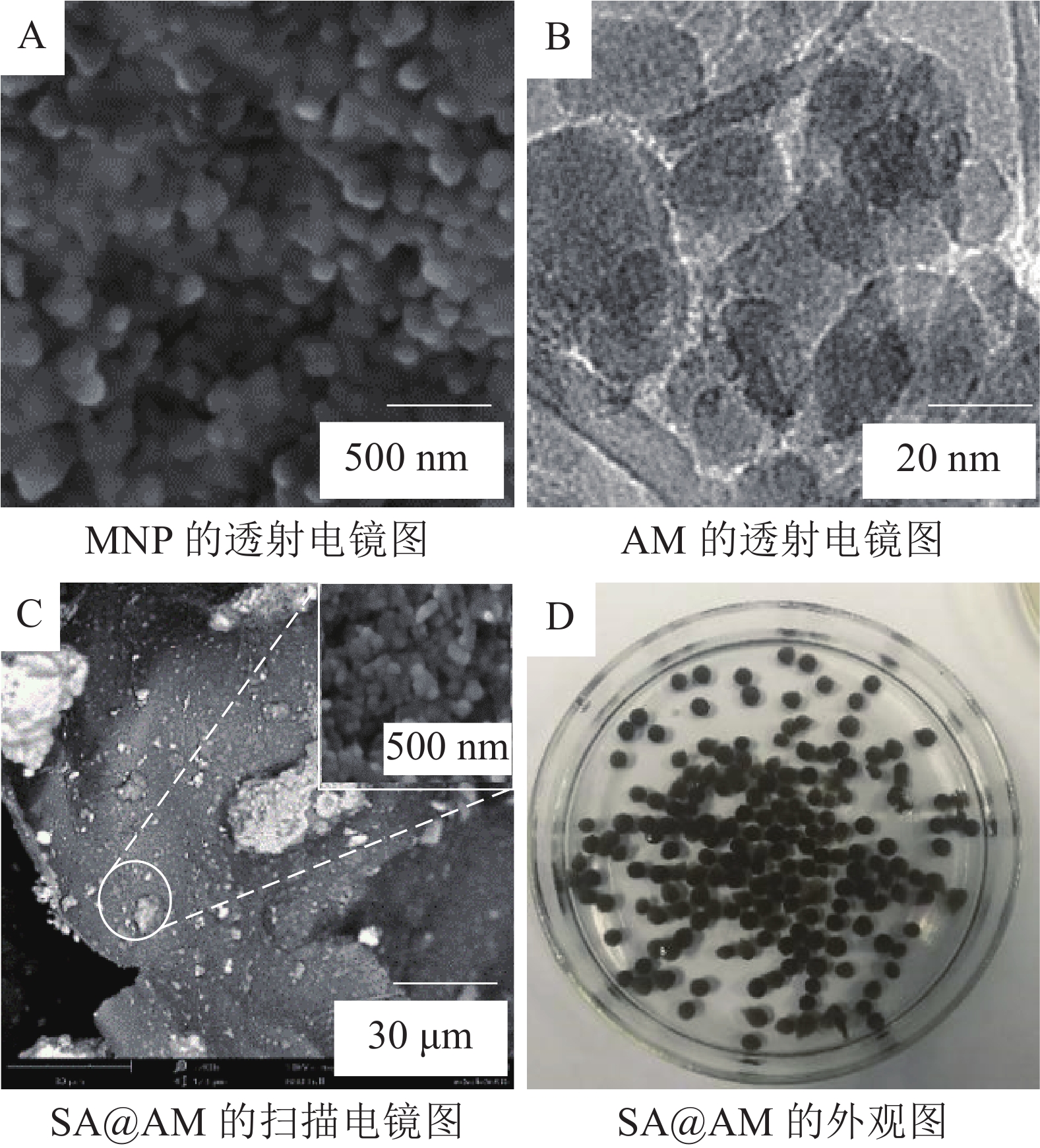 产物MNP、中间产物(AM)和终产物(SA@AM)的扫描电镜(TEM)、透射电镜(SEM电镜)照片和复合凝胶球外观照片如图2的所示。从图2可见:氨基改性AM的扫描电镜(SEM)图2A看出其结构单一,大小较为均匀,呈圆球状,颗粒堆积成簇。AM的透射电镜(TEM)图(图2B)看出:端氨基AM表面紧致,为不规则、无定形态,尺寸为15~20 nm,中心部分是磁性核粒子为黑色,边缘部分较为松散,为白色透明状,说明氨基硅烷在磁性核粒子上包覆成功。同时,图2显示,AM发生微量堆积而且相互吸附,可能是由于AM自带的磁力使其发生团聚成簇现象[13]。SA@AM的冻干凝胶球SEM图2C看出:AM颗粒附着包覆在海藻酸钠凝胶上,凝胶球含有较多褶皱和大的空隙。这是凝胶球高吸附性能的基础。SA@AM的外观图2D看出:凝胶球为黑色球型,表面光滑而且具有一定的弹性。因此,从表面形貌定性分析,验证得到了目标复合产物。