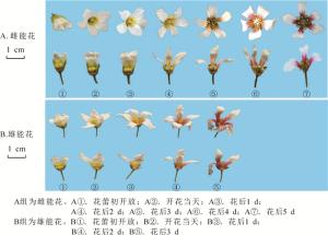各无性系另选10株作为柱头可授性和花粉活力检测取样植株。于盛花期分别采集花蕾初开放(图 1A①)、开花当天(花蕾完全开放,图 1A②)、花后1~5 d的雌能花(图 1A③~⑦),每无性系每时期取20朵,用联苯胺-过氧化氢法测定柱头可授性[16]。