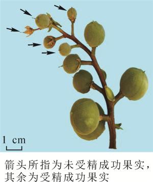 各无性系另选36株作为授粉试材,设计交互授粉、混合授粉和自然授粉,其中混合授粉所授花粉为5个无性系混合花粉(mixed pollination, MP),自然授粉组(ck)为对照。因文冠果成熟果实均来自异花授粉[7-8],故不设计自交授粉。授粉配置设计见表 1。每个授粉组合每重复授粉100朵雌能花,3次重复。因文冠果雌能花花药不开裂,故不去除雌能花雄蕊,在开花前1 d识别、去除将要授粉花序上的雄能花和已经开放的雌能花,套袋即可。授粉时,采集正在散粉的雄能花,除去花瓣,用花药涂抹开花当天的雌能花柱头,直到可以明显看到柱头上黄色的花粉为止,之后套袋。授粉后15 d(5月23日),第1次生理落果期结束,结果枝上的果实分为2种(图 2),一种是子房略微膨大的未成功受精果实,另一种是子房明显膨大的受精成功果实[16,18]。5月23日,统计受精率(子房明显膨大果实数/授粉花朵数×100%);7月19日(即果实采收前),统计最终坐果率(成熟果实/授粉花朵数×100%),并采收各授粉组合果实,进行产量及种实性状测定。