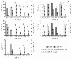 各授粉组合的受精率和最终坐果情况(图 3)表明:以10号无性系为母本(图 3A),10×16受精率显著高于其他授粉组合,10×16、10×119和10×15显著提高了10号无性系最终坐果率,与10ck相比,分别提高467.48%、328.83%和206.74%。由图 3B可知:人工授粉可以显著提高14号无性系的受精率和最终坐果率;与14ck相比,14×16对母本受精率提高最为显著,14×15对母本最终坐果率提高最为显著。以15号无性系为母本(图 3C),仅15×10、15×MP和15×16提高了母本的受精率和最终坐果率;15×14和15×119最终坐果率为0和1.05%,说明14号、119号无性系不适合做15号授粉树。以16号无性系为母本(图 3D),与16ck相比,仅16×15显著提高了母本受精率。16×MP组合受精率为0。最终坐果率最高的是16ck(7.38%),其次是16×15(5.45%)和16×14(4.00%)。119号无性系为母本(图 3E)时,各授粉组合受精率为0~3.64%,119×MP对母本最终坐果率提高最为显著,119ck、119×10、119×15最终坐果率均为0。因此,10号、14号、15号、16号无性系均不适合做119号无性系授粉树。