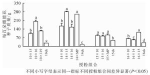 对各无性系自然授粉、混合授粉和交互授粉中受精率、最终坐果率排名前3位的授粉组合子代果实进行产量计算和种实性状测定,为便于比较,将种子产量转换成每百朵雌能花种子产量。因10×MP、16×MP、15×119和119号无性系全部授粉组合最终结果个数为0~4,样本数量小,故未进行产量计算和种实性状测定。