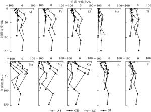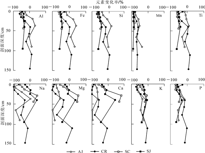 $$ \Delta X = \left[ {\left( {{X_{\rm{s}}}/{I_{\rm{s}}}} \right)/\left( {{X_{\rm{r}}}/{I_{\rm{r}}}} \right) - 1} \right] \times 100\% 。 $$ (5) 式(5)中:Xs、Xr分别为X元素在土壤和岩石中的质量分数;Is、Ir分别是稳定元素在土壤和岩石中的质量分数。ΔX>0表示该元素在成土过程中发生富集,ΔX<0则表示该元素在成土过程中有亏损或迁移。