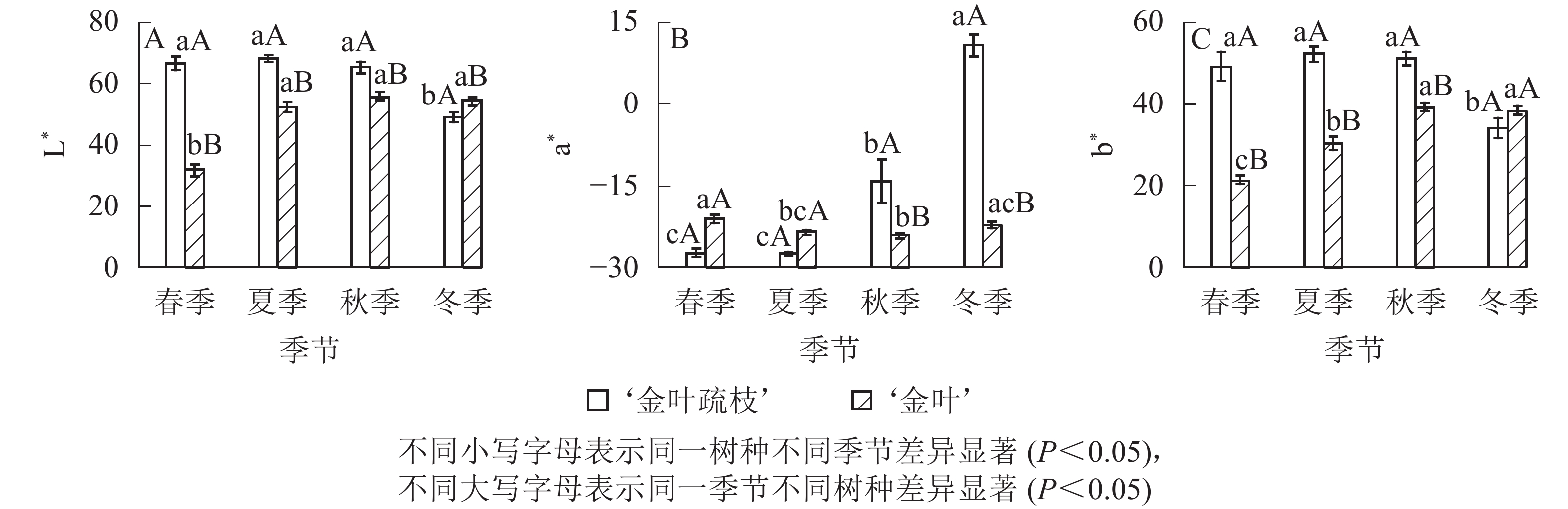 由图1C可知:‘金叶疏枝’的b*值4季均为正值,春、夏、秋3季之间无显著差异(P>0.05),冬季显著低于其他季节(P<0.05)。‘金叶’b*值4季也均为正值,秋、冬季无显著差异(P>0.05);春、夏、秋3季呈递进式显著增高(P<0.05),秋季最高,且显著高于春、夏季(P<0.05);其次是冬季,也显著高于春、夏季(P<0.05);绝对值最低出现在春季。春、夏、秋3季‘金叶疏枝’b*值均显著高于‘金叶’(P<0.05);冬季2种彩色针叶树b*值无显著性差异(P>0.05)。