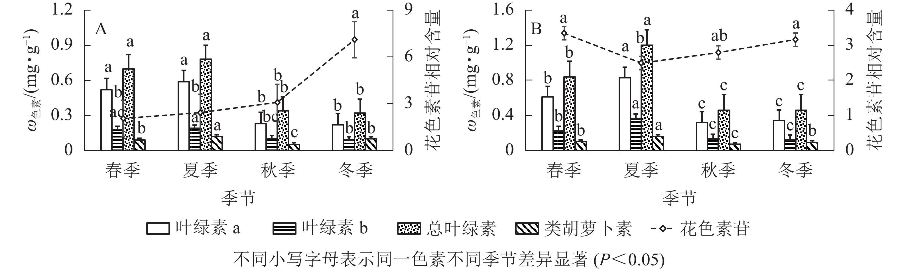 由图2A可知:‘金叶疏枝’叶绿素a、叶绿素b、总叶绿素在不同季节变化趋势相同,秋、冬季显著降低(P<0.05)。其中,叶绿素a质量分数在夏季最高,比秋、冬季显著高156.52%、168.18%(P<0.05);其次是春季,比秋、冬季显著高126.08%、136.36%(P<0.05),冬季最低。总叶绿素质量分数夏季最高,比秋、冬季显著高129.41%、143.75%(P<0.05),冬季最低。叶绿素b质量分数在夏、秋季间显著下降(P<0.05),春夏、秋冬之间无显著性差异;夏季最高,比秋、冬季显著高90.00%、111.11%(P<0.05);其次是春季,比冬季显著高100.00%(P<0.05)。‘金叶疏枝’类胡萝卜素质量分数呈现先增大后减小再增大趋势;夏季最高,比春、秋、冬3季显著高33.33%、140.00%、20.00%(P<0.05);其次是冬季,比秋季显著高100.00%(P<0.05),秋季最低。‘金叶疏枝’花色素苷相对含量在春、夏、秋季均无显著性差异(P>0.05),冬季比前3季显著高246.82%、192.59%、130.84%(P<0.05)。