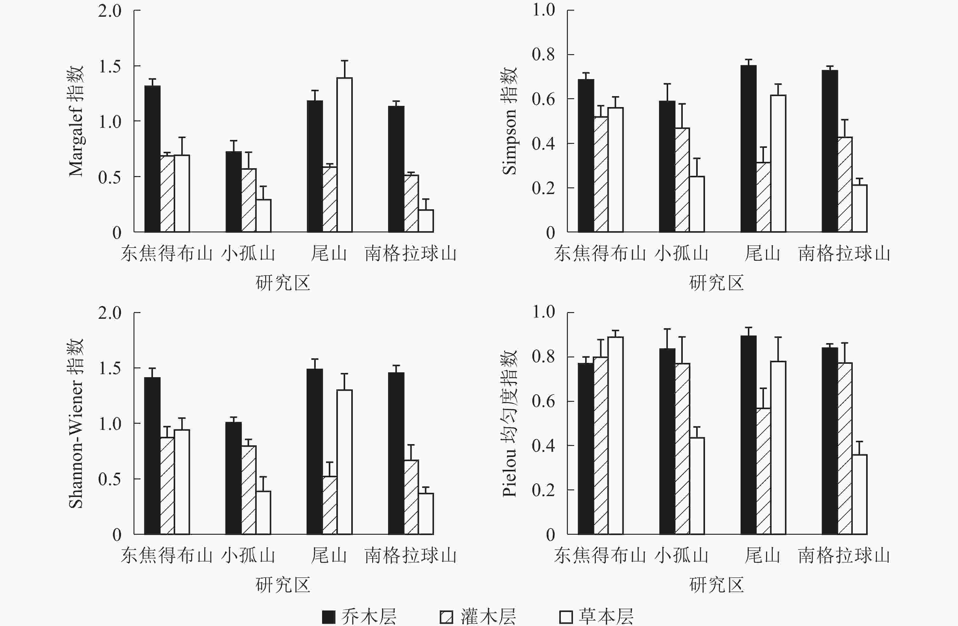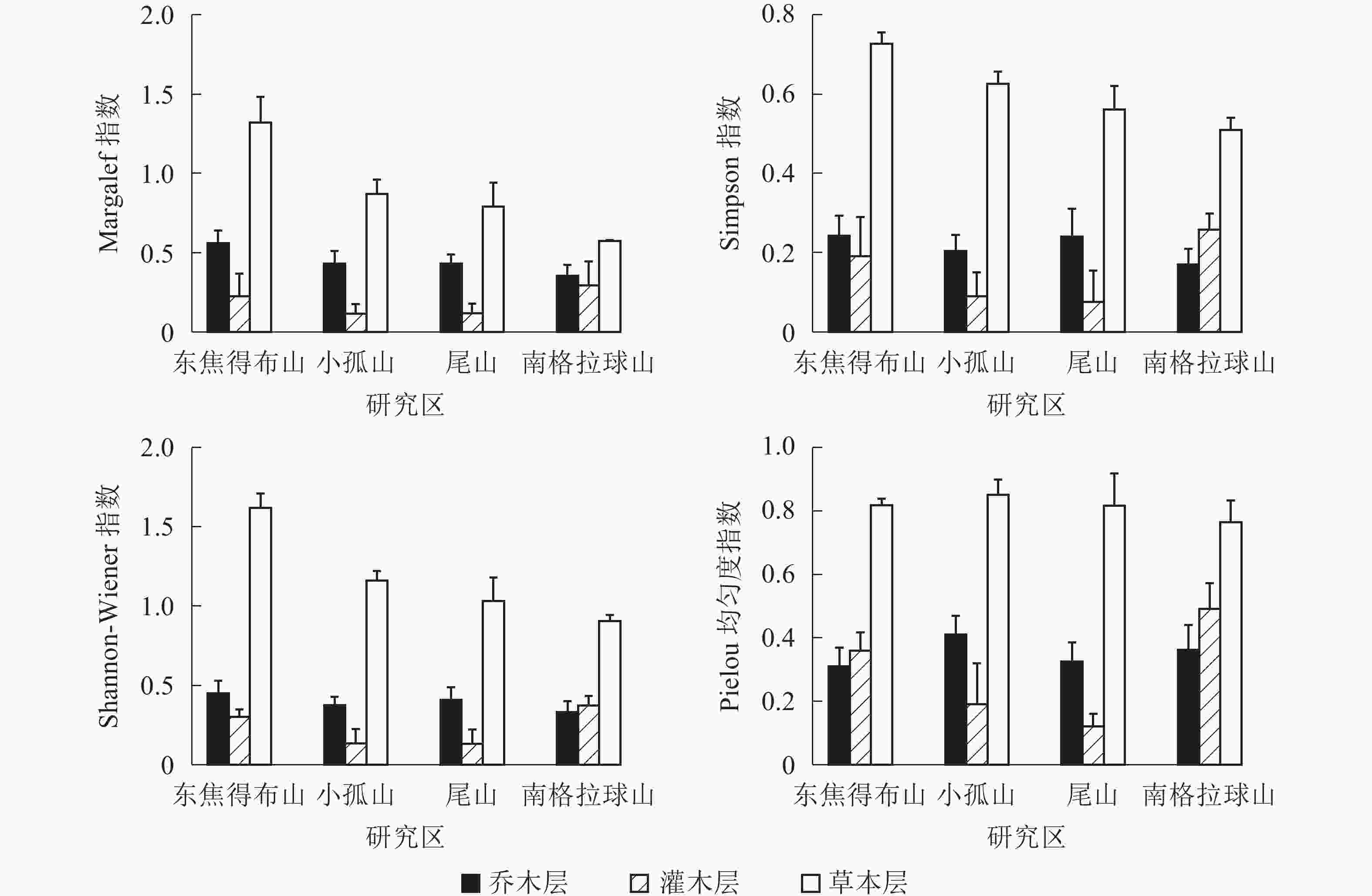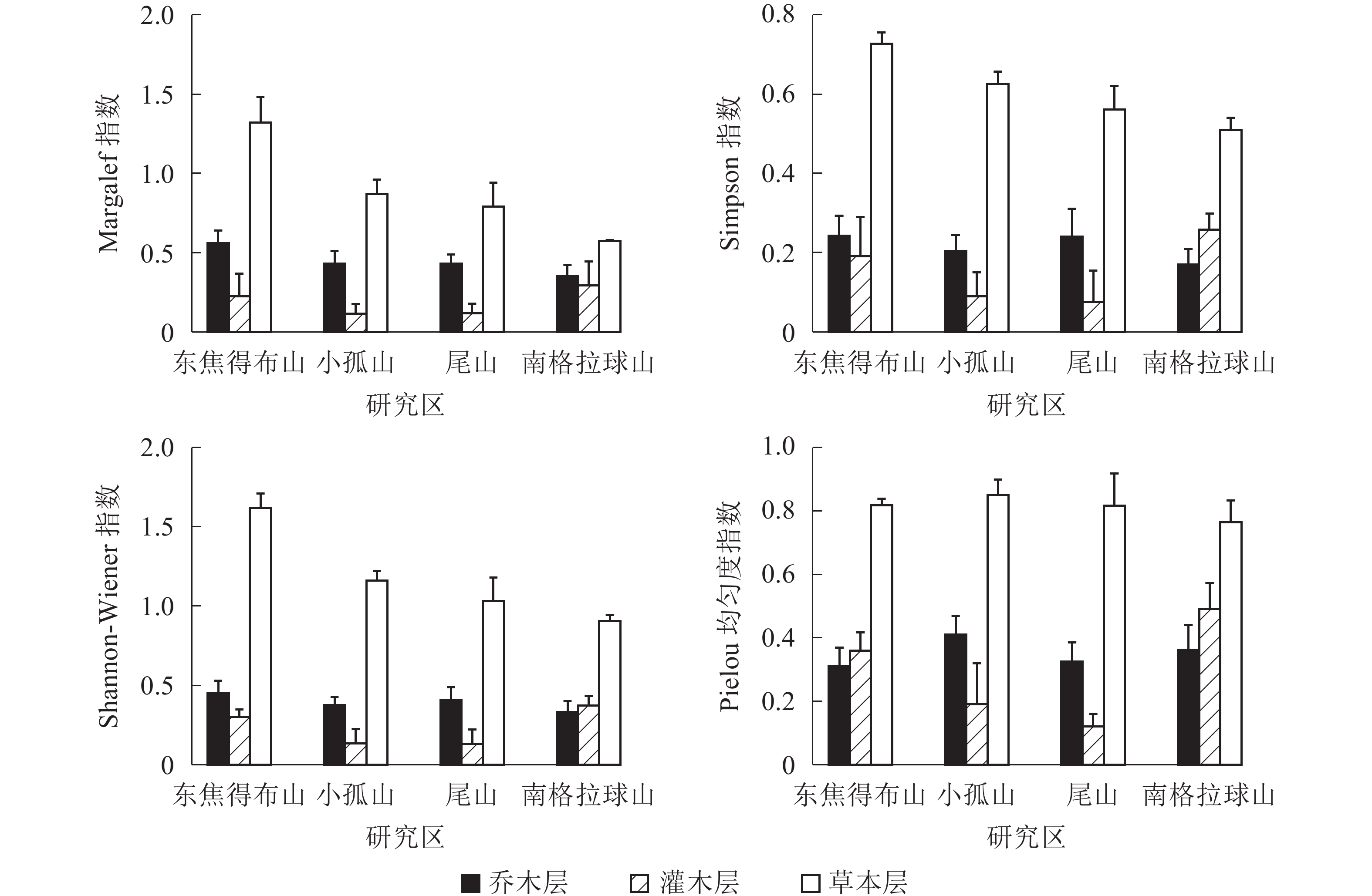 • 图2可见:4座火山南坡森林群落中的各层次物种多样性有差异。Margalef指数、Simpson指数、Shannon-Wiener指数和Pielou指数从大到小依次为草本层、乔木层、灌木层。乔木层Margalef指数、Simpson指数和Shannon-Wiener指数最大值都是东焦得布山,最小值都是南格拉球山;乔木层Pielou指数最大值为小孤山,最小值为东焦得布山。灌木层4种多样性指数最大值都为南格拉球山,最小值都为尾山;草本层Margalef指数、Simpson指数和Shannon-Wiener指数最大值都是东焦得布山,草本层Pielou指数最大值为小孤山,草本层4种多样性指数最小值都为南格拉球山。可见,4座火山南坡森林群落物种多样性主要受草本层和乔木层的影响。乔木层东焦得布山的丰富度指数、多样性指数和优势度指数都最大,而南格拉球山4种多样性指数都最小;灌木层南格拉球4种多样性指数都最大,而尾山4种指数都最小;草本层东焦得布山的丰富度指数、多样性指数和优势度指数都最大,而南格拉球山4种多样性指数都最小。