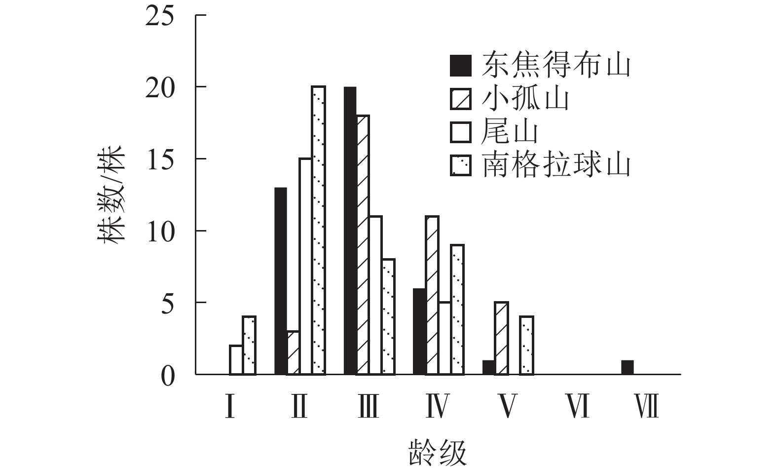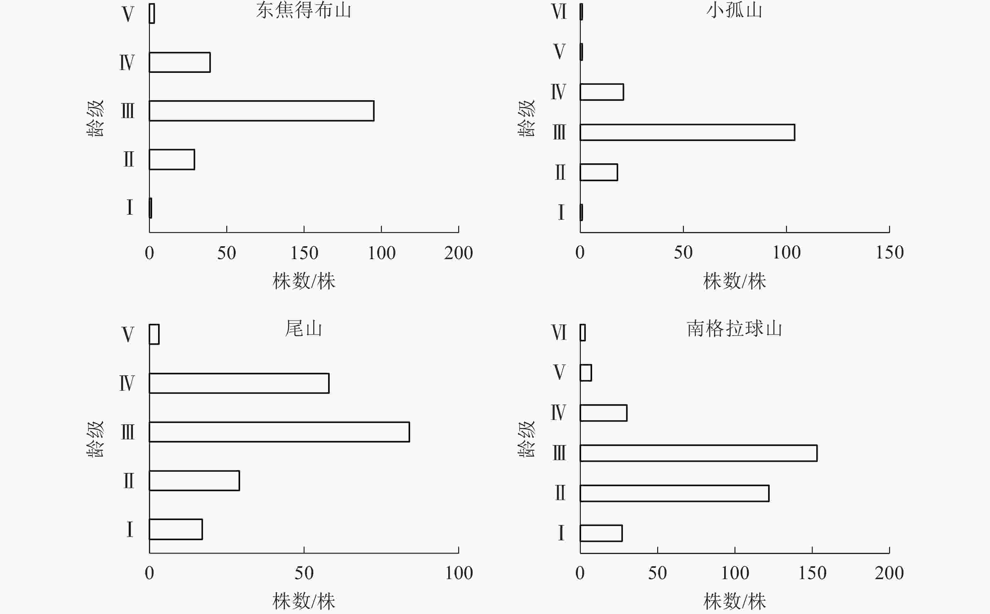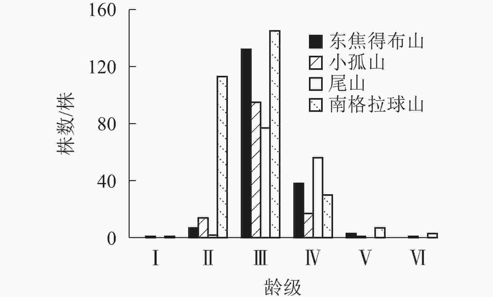 • 图3可见:4座火山北坡森林群落的年龄结构均为稳定型,群落表现稳定增长状态。小孤山Ⅱ~Ⅵ龄级(40~80 a)的乔木株数占个体总数的69.74%,且无Ⅰ龄级(0~20 a)个体,处于成熟树阶段,群落的稳定性较差,其余3座山Ⅱ~Ⅲ龄级(20~60 a)的乔木株数分别占总数的73.53%(东焦得布山)、56.56%(尾山)和75.90%(南格拉球山),处于中龄树阶段,群落的稳定性较好。