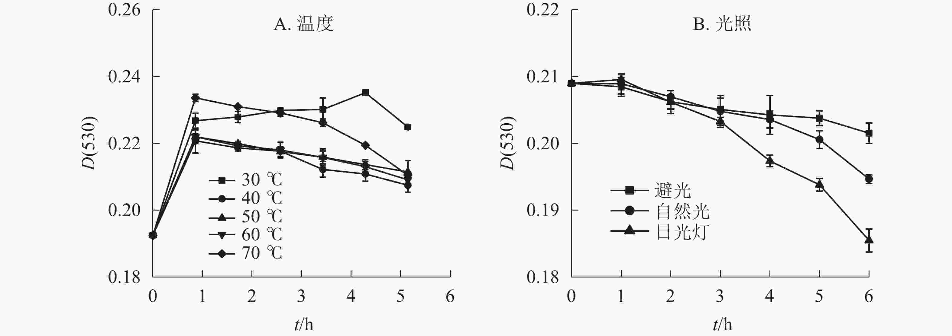 测定配好的花色苷提取液在各检测波长下的吸光度,作为初始吸光度D0。设置3种光源:①自然光[室内向阳窗台温度(29.5±0.5) ℃];②日光灯光照度(3 680±81) lx,温度(24.5±0.5) ℃;③避光处理,温度(24.5±0.5) ℃;隔1 h取样1次,连续监测6 h,测定记录吸光度(D)的变化情况,重复3次。