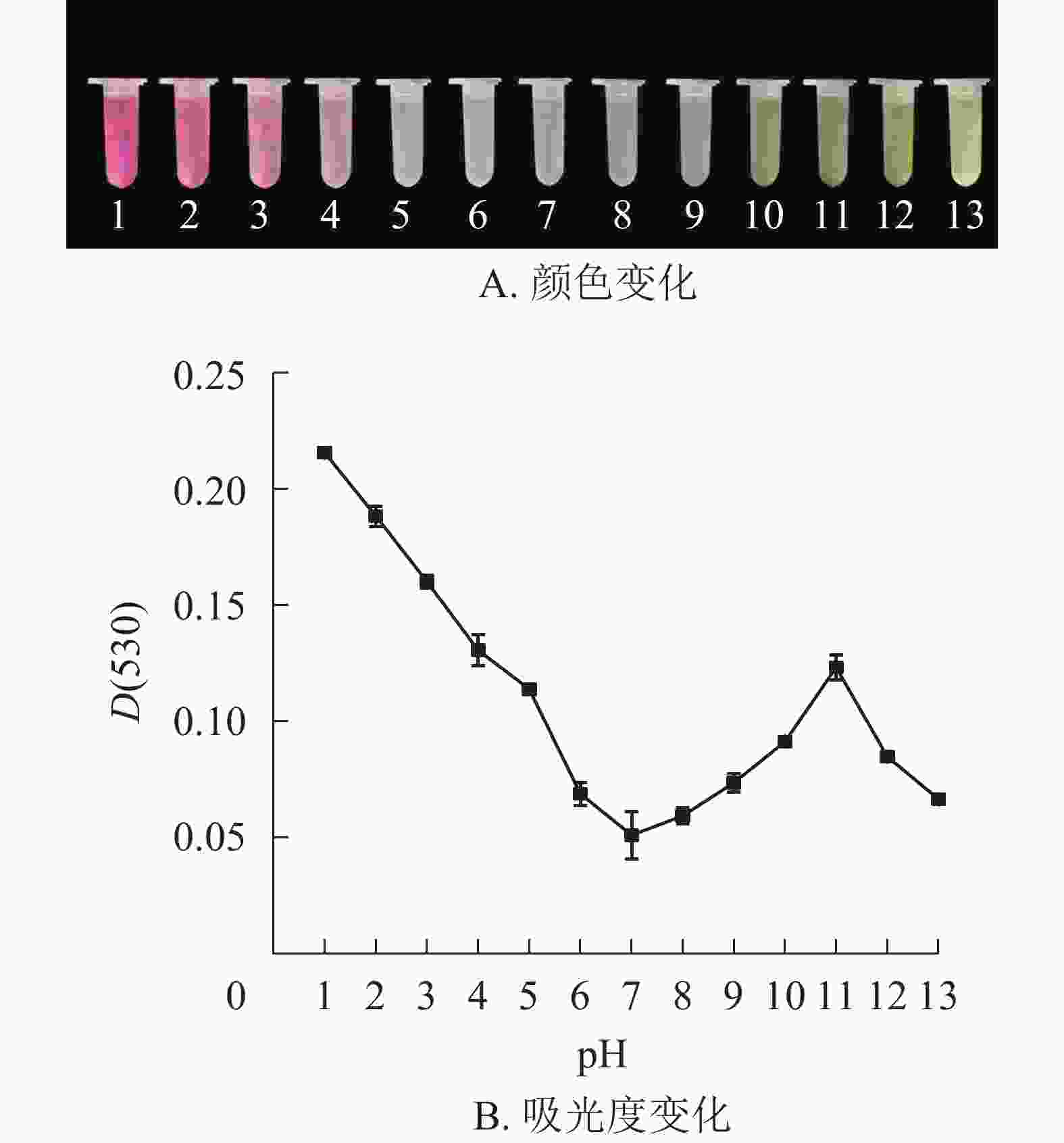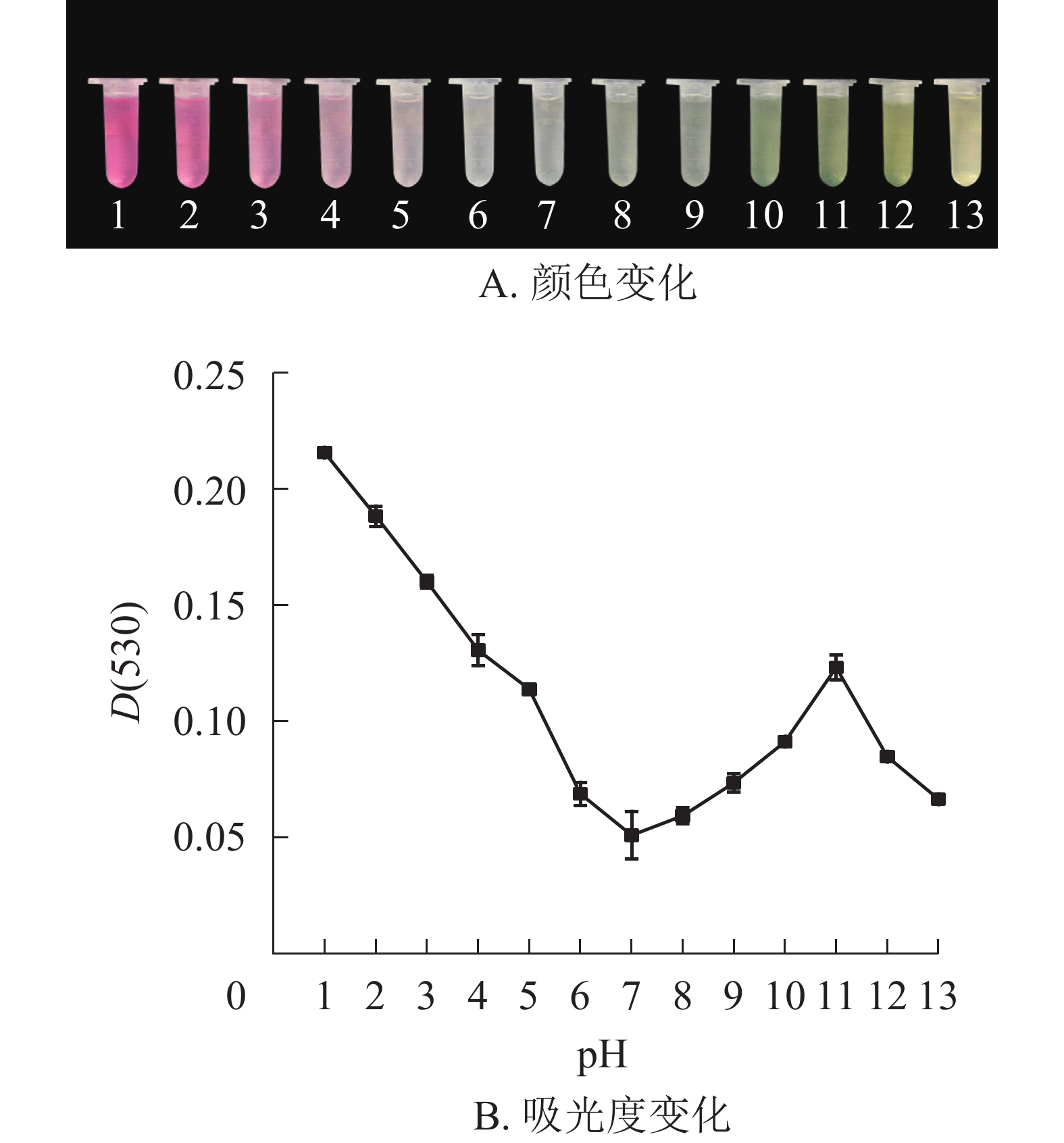 取1.8 mL换锦花花色苷提取液分别加入氢氧化钠或盐酸溶液,使花色苷溶液形成不同pH梯度:pH为1.0~13.0,梯度间隔为1。观察花色苷提取液颜色的变化,记录吸光度,重复3次。