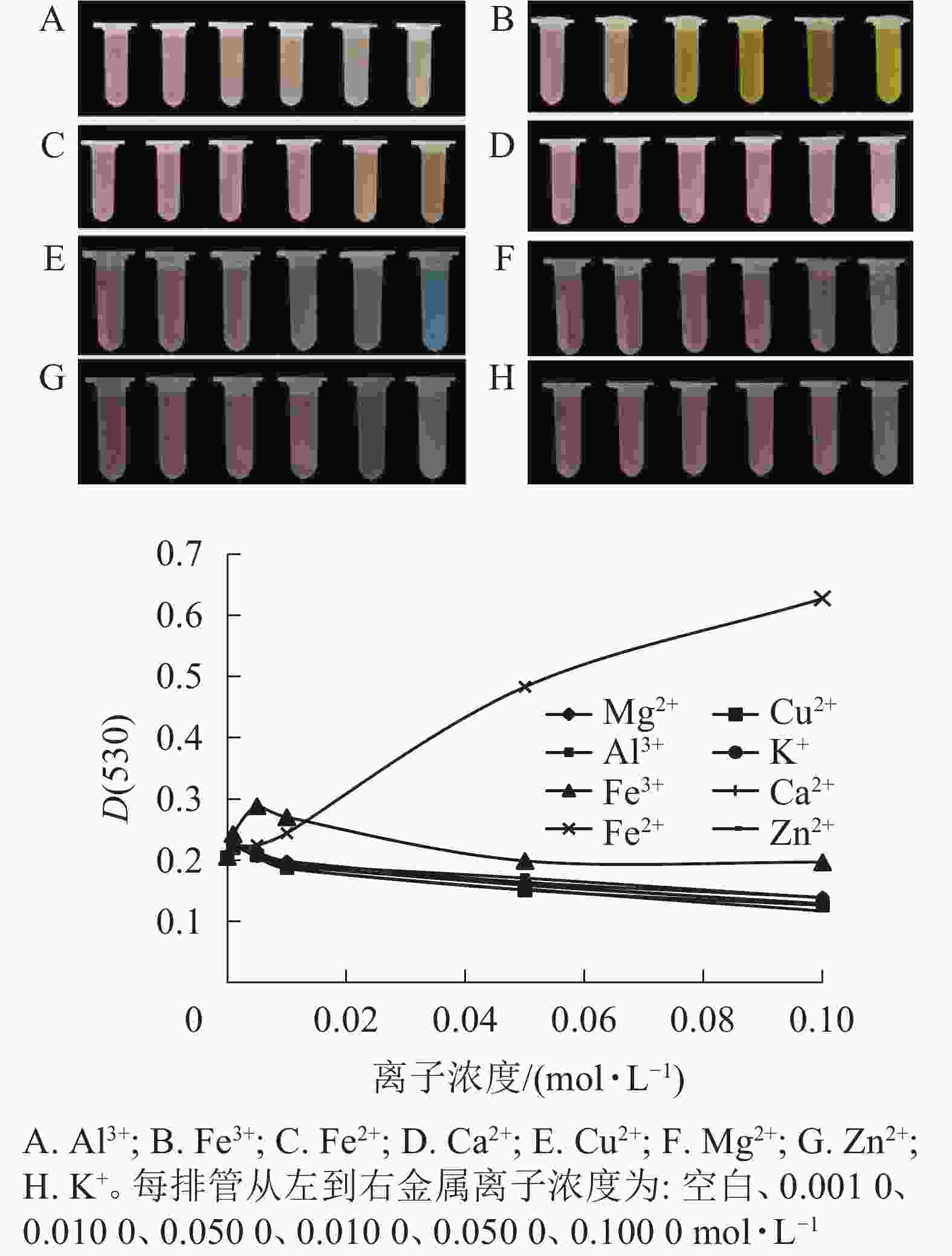 取1.8 mL换锦花花色苷提取液分别加入不同浓度金属离子缓冲液至2.0 mL,混匀,观察反应液颜色变化后避光平衡2 h。在400~600 nm内,采样间隔2 nm扫描,确定最大吸收峰以及对应的吸光度。所用金属离子分别为Fe3+、Fe2+、Ca2+、Al3+、Zn2+、Mg2+、Cu2+、K+,各溶液的离子最终浓度为0、0.001 0、0.005 0、0.010 0、0.050 0、0.100 0 mol·L−1,重复3次。