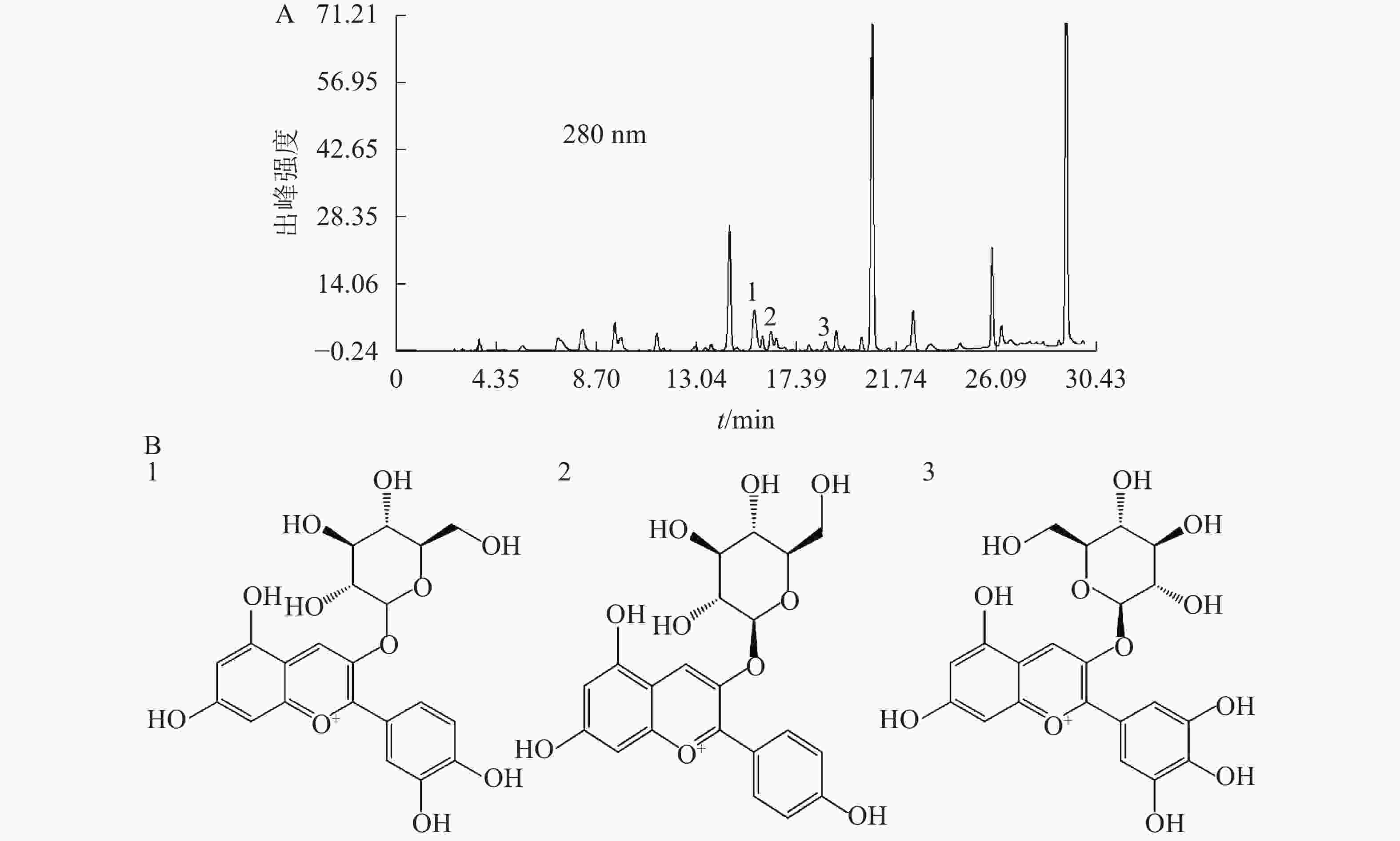基于代谢组分析结果,选择矢车菊素-3-O-葡萄糖苷、天竺葵素-3-O-葡萄糖苷和飞燕草素-3-O-葡萄糖苷为标准品,换锦花花色苷中这3种成分的质量分数分别为2.95、0.41和0.42 mg·g−1。图4A为换锦花花色苷提取液在280 nm处的HPLC色谱图,得到矢车菊素-3-O-葡萄糖苷、天竺葵素-3-O-葡萄糖苷和飞燕草素-3-O-葡萄糖苷峰面积及其具体出峰时间。利用Formula Predictor 4.2软件对3种不同的花色苷结构进行检索,得到矢车菊素-3-O-葡萄糖苷、天竺葵素-3-O-葡萄糖苷和飞燕草素-3-O-葡萄糖苷苷元结构(图4B)。