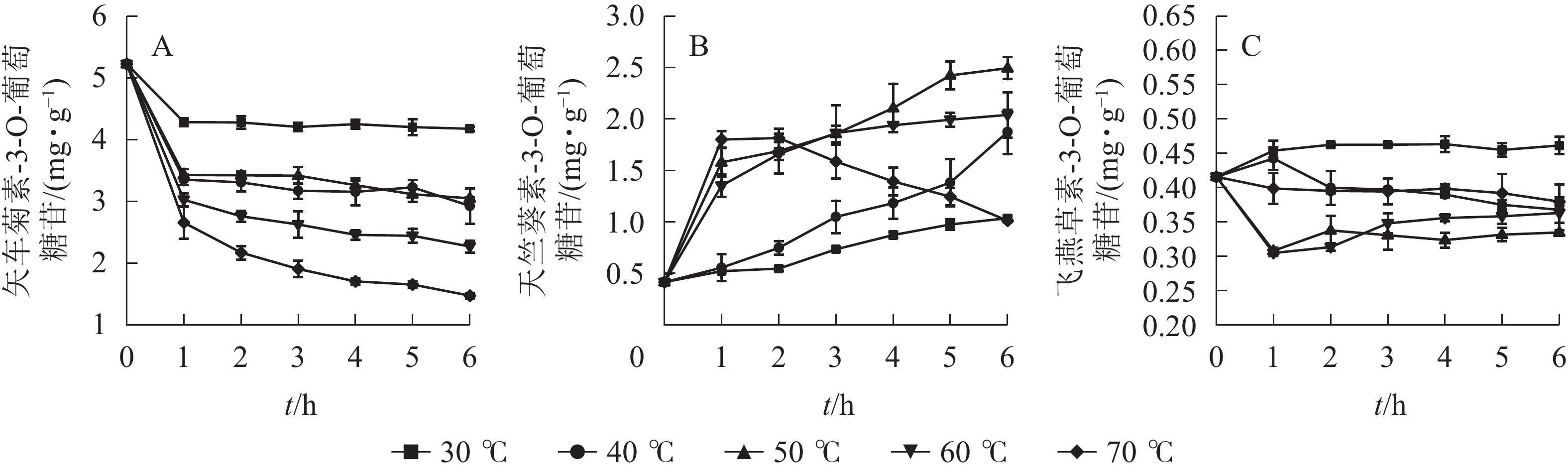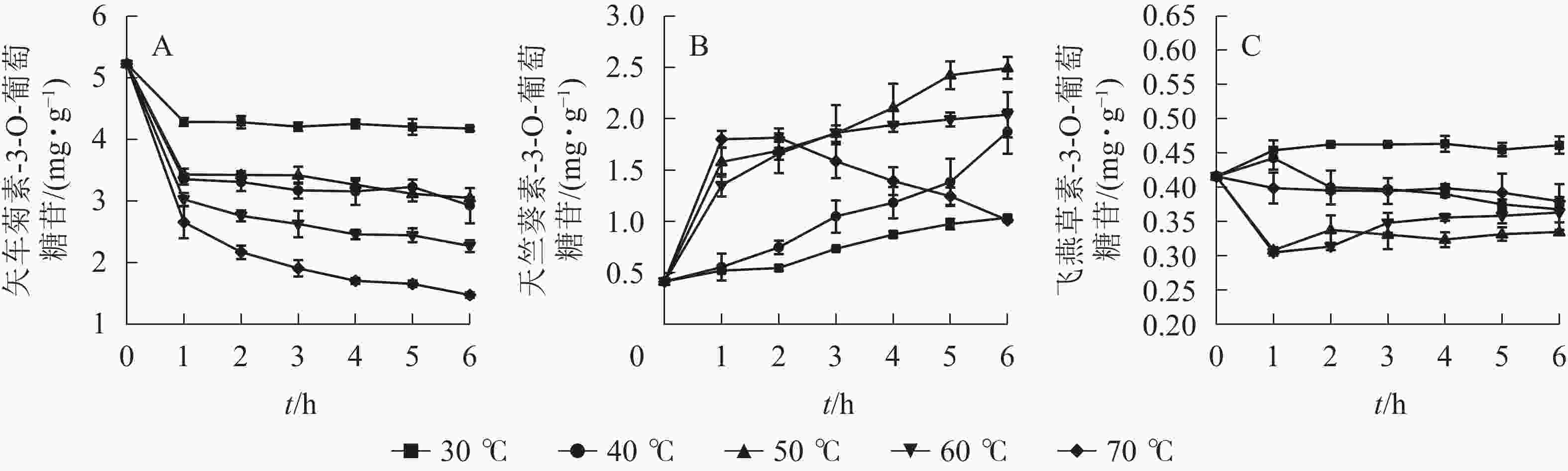换锦花3种花色苷随着温度的升高和时间的延长呈现不同的变化趋势(图5),矢车菊素-3-O-葡萄糖苷质量分数逐渐降低、天竺葵素-3-O-葡萄糖苷质量分数逐渐上升、飞燕草素-3-O-葡萄糖苷质量分数变化不明显,与提取液颜色变化趋势一致。花色苷提取液于30~70 ℃处理6 h后,矢车菊素-3-O-葡萄糖苷质量分数分别降低了20.11%、43.99%、41.65%、56.57%、71.85%。相同条件下,30~60 ℃时天竺葵素-3-O-葡萄糖苷质量分数比对照分别提高了150.42%、352.80%、502.74%、393.02%。花色苷提取液颜色由砖红色逐渐变为橙红色,可能是由于温度升高导致矢车菊素-3-O-葡萄糖苷失去1个羟基基团而转变为1个羟基基团的天竺葵素-3-O-葡萄糖苷,在70 ℃ 2 h后天竺葵素-3-O-葡萄糖苷质量分数急剧下降,可能是高温破坏了天竺葵素-3-O-葡萄糖苷结构;飞燕草素-3-O-葡萄糖苷质量分数变化不明显,可能由于飞燕草素-3-O-葡萄糖苷的结构中有较稳定的3个羟基基团。