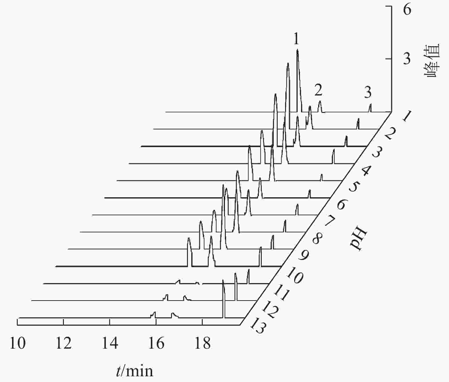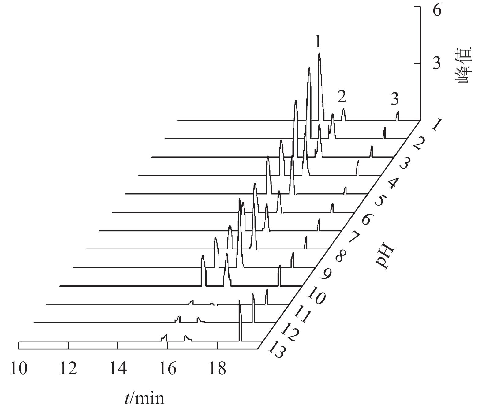 换锦花矢车菊素-3-O-葡萄糖苷、天竺葵素-3-O-葡萄糖苷和飞燕草素-3-O-葡萄糖苷的峰值随着提取液酸碱度的变化而变化。花色苷提取液pH为1.0~13.0时,随着pH的增加,矢车菊素-3-O-葡萄糖苷峰值逐渐降低,飞燕草素-3-O-葡萄糖苷峰值逐渐升高,而天竺葵素-3-O-葡萄糖苷峰值变化不明显(图7)。由此可见,酸碱度对天竺葵素-3-O-葡萄糖苷结构的稳定性影响较大,矢车菊素-3-O-葡萄糖苷结构在酸性条件下较稳定,而飞燕草素-3-O-葡萄糖苷的结构则在碱性条件下比较稳定。