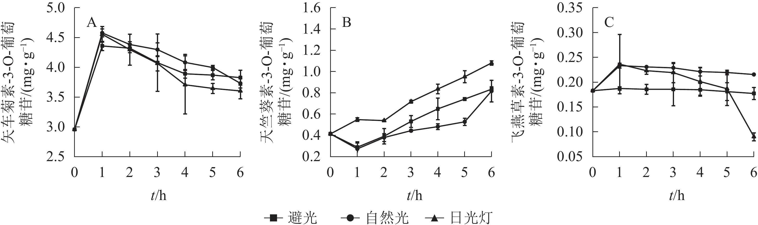 换锦花不同花色苷质量分数随着光照和时间的变化而变化(图6),在避光、自然光和日光灯条件下,矢车菊素-3-O-葡萄糖苷质量分数均呈下降趋势,与原提取液相比分别下降了26.75%、28.58%、31.02%;天竺葵素-3-O-葡萄糖苷质量分数则分别升高了232.63%、225.75%、330.90%。在避光和自然光照条件下飞燕草素-3-O-葡萄糖苷变化趋势平缓,但在日光灯光照1 h后呈现下降趋势,5 h后飞燕草素-3-O-葡萄糖苷质量分数呈直线下降,到6 h时仅为原提取液质量分数的4.35%。日光灯下的矢车菊素-3-O-葡萄糖苷和飞燕草素-3-O-葡萄糖苷质量分数减少最快,天竺葵素-3-O-葡萄糖苷质量分数上升最快。可见在3种不同光源中,日光灯对花色苷具体成分影响很大。这一结果和不同温度条件下花色苷质量分数变化趋势一致,随着光照强度和时间的增加,矢车菊素-3-O-葡萄糖苷逐渐降低、天竺葵素-3-O-葡萄糖苷逐渐上升、飞燕草素-3-O-葡萄糖苷除了日光灯下过长时间照射外急剧下降,短时间内没有明显的变化。可能是由于飞燕草素-3-O-葡萄糖苷B环结构中有3个较为稳定羟基基团[23]。长时间强光照射破坏了飞燕草素-3-O-葡萄糖苷B环结构的羟基基团,导致其质量分数骤然下降。