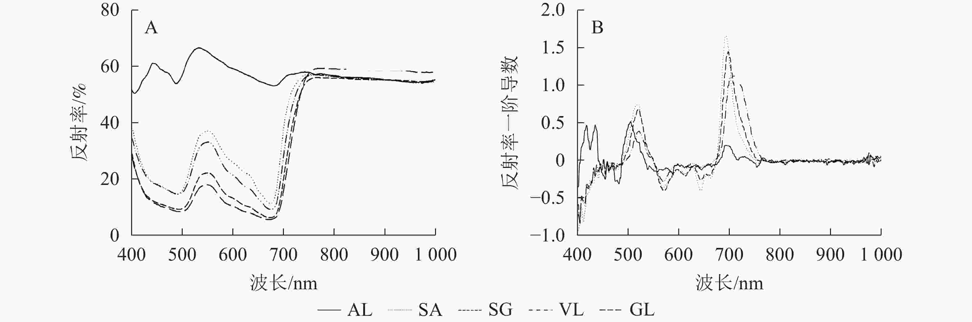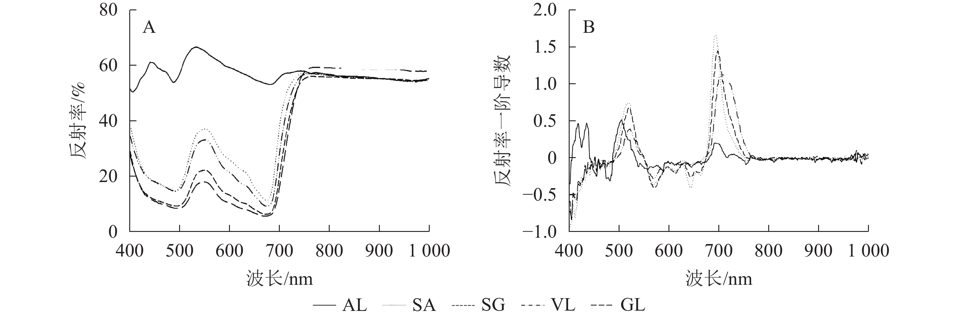 除AL外,其他的反射光谱曲线均具有典型的绿色植被反射光谱特征,在500与670 nm左右的位置有2个低反射区。不同叶片反射光谱的反射率在蓝光区(430~470 nm)、绿光区(500~560 nm)不同,SA在绿光区明显高于SG、VL、GL,在556 nm 处达最高值,为0.385,比VL、SG和GL分别高8.0%、46.7%和51.2%;GL在近红外区(780~1 000 nm)最高,达0.600,其他叶片趋于一致(图2A)。由一阶导数(图2B)可以看出,除AL外,其他叶片在绿光区(550~560 nm)和红光区(650~760 nm)均出现最大峰值,黄光区(560~600 nm)出现最小峰值。