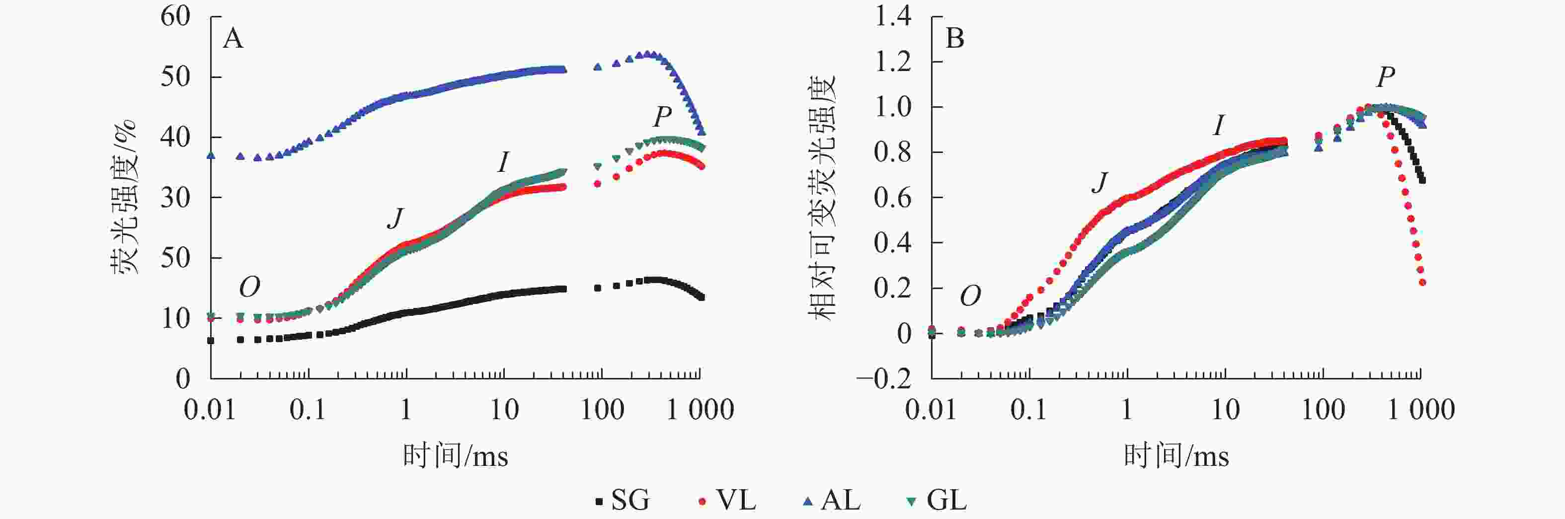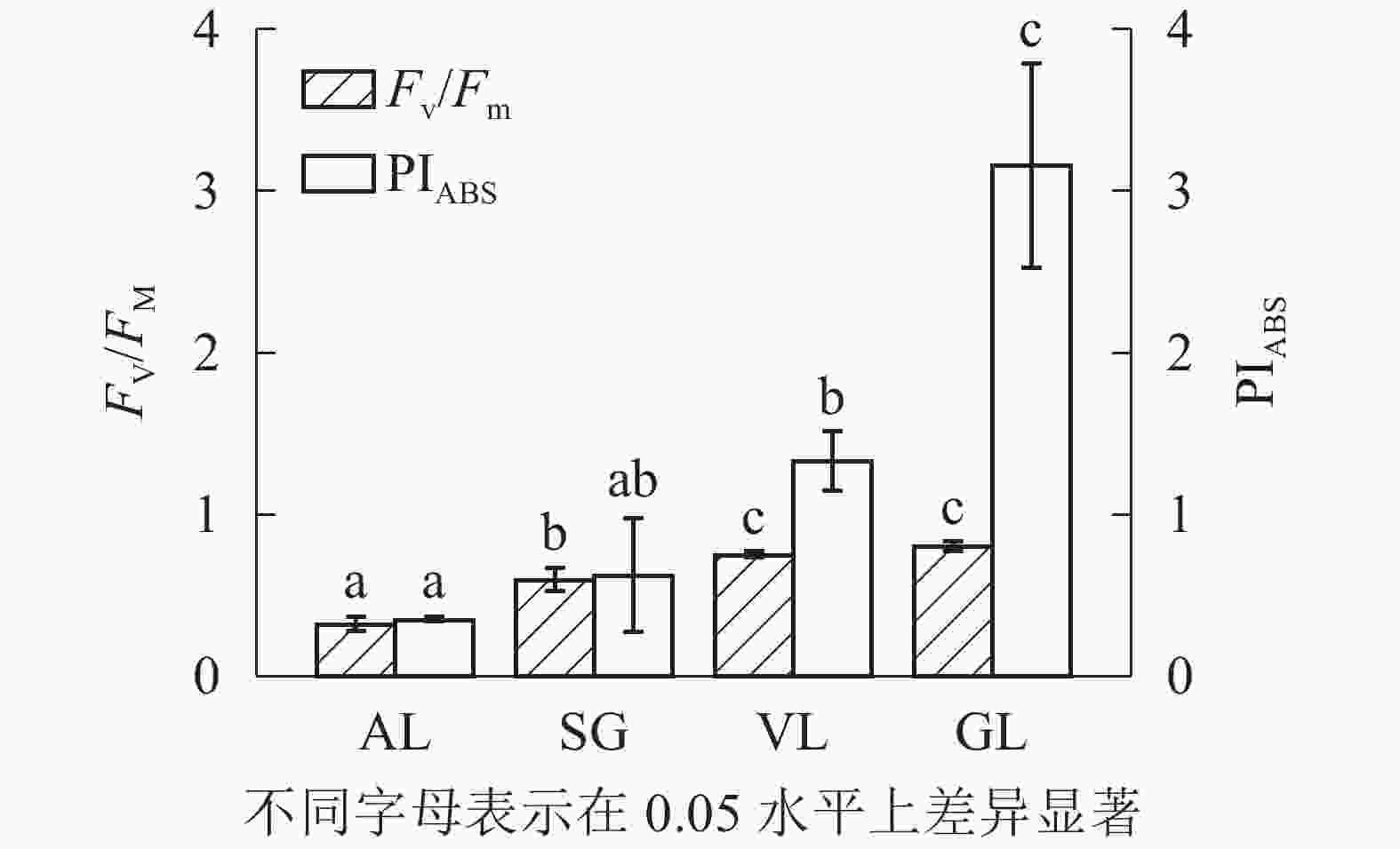 由图4可以看出:GL的Fv/Fm为0.80,SG和VL的Fv/Fm降低为0.72和0.75,说明它们反应中心的活性有所下降。而AL显著(P<0.05)低于其他叶片,仅为0.32。GL的Fv/Fm显著(P<0.05)高于AL和SG,VL的Fv/Fm占GL的94%。说明反应中心活性从大到小依次为GL、VL、SG、AL。叶片光化学性能指数PIABS可以更为准确地反映植物光合机构的状态[22]。其中:ψP0为暗适应后的最大光化学效率,ψ0为反应中心捕获的激子将电子传递到电子传递链中QA−下游电子受体的概率。SG与VL的PIABS差异不显著(P>0.05),但都与GL差异显著(P<0.05),分别为GL的46.2%与42.1%。AL的PIABS最低,为0.32。VL与GL的Fv/Fm无显著差异(P>0.05),PIABS存在显著差异(P<0.05),GL较VL高56.3%。