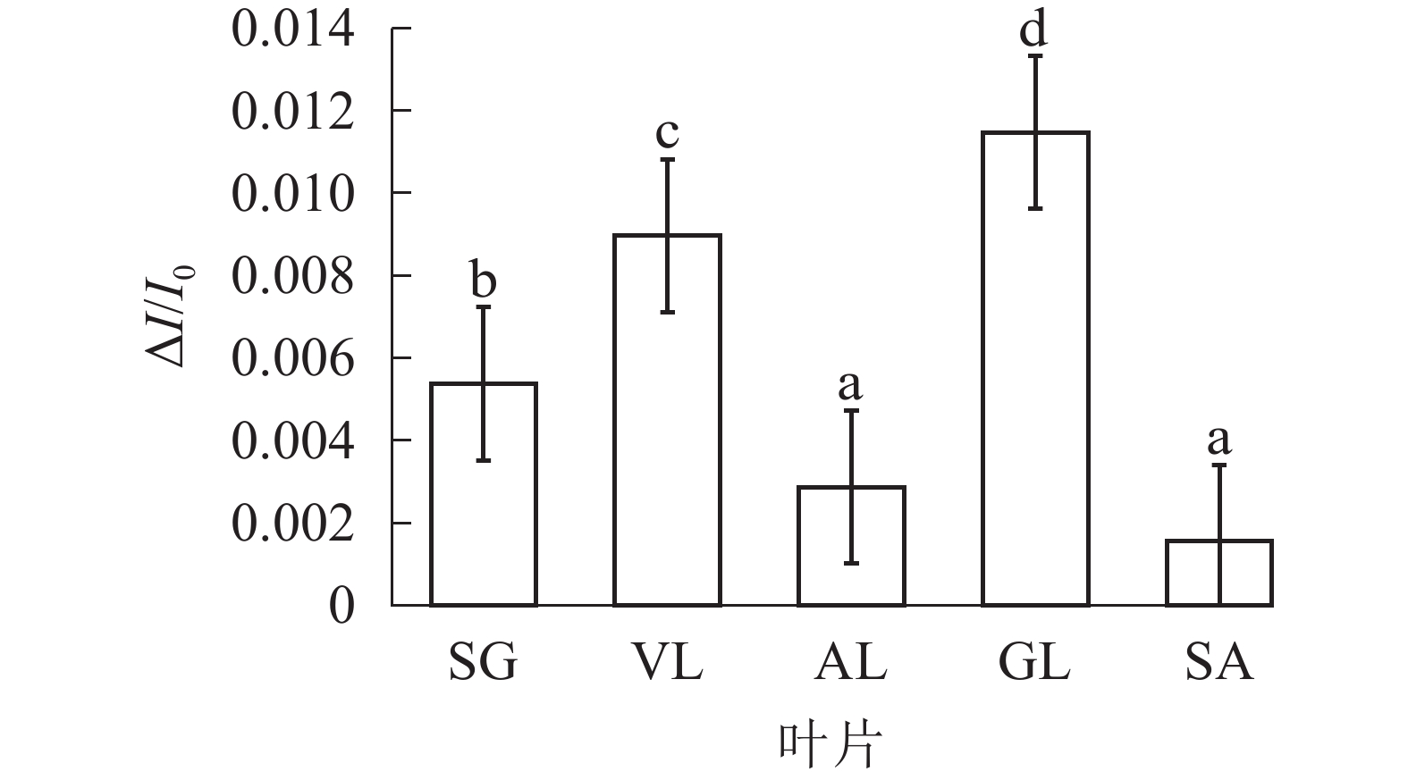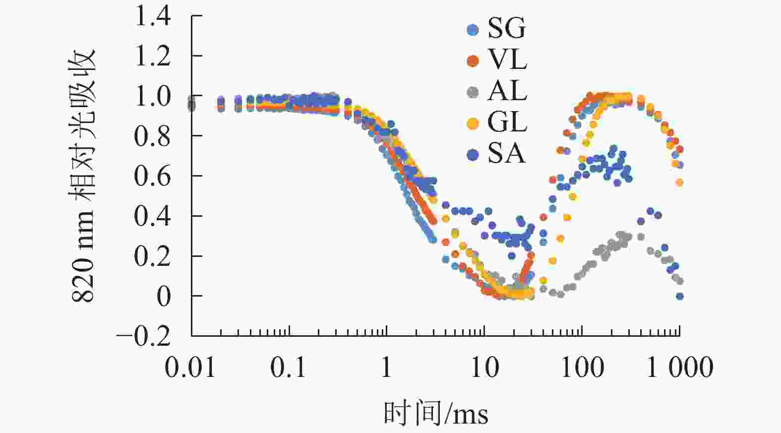 由图6可以看出:各叶片在t时的820 nm相对吸收值(It)呈“V”型变化,且SG、VL、GL变化趋势相同。在16 ms时,各叶片的820 nm相对光吸收值达到最低点,1~16 ms,各叶片的820 nm相对吸收值均呈现下降趋势,且下降速度从大到小依次为SG、VL、GL、AL、SA。180 ms时,820 nm相对光吸收值达到最大值,从大到小依次为SG、VL、GL、SA、AL。16~180 ms,各叶片的820 nm相对吸收值整体呈现上升趋势。由图7可以看出:GL的ΔI/I0最大,且与其他叶片差异显著(P<0.05),SA的ΔI/I0最低,AL与SA的ΔI/I0差异不显著(P>0.05),与其他叶片差异显著(P<0.05)。PSⅠ最大氧化还原能力从大到小依次为GL、VL、SG、AL、SA。花叶矢竹条纹叶白色部分(SA)复绿之后(AL)ΔI/I0上升,说明PSⅠ活性上升。