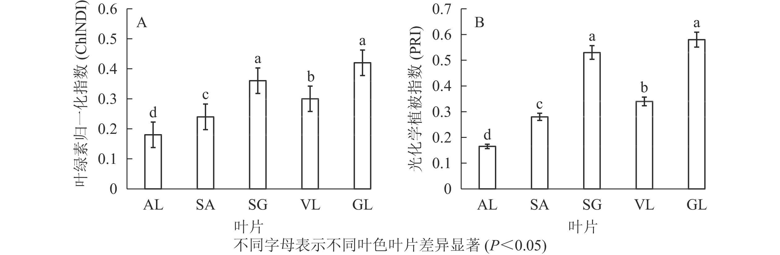 图3所示:不同叶色矢竹叶片的叶绿素归一化指数、光化学植被指数变化趋势一致,从大到小依次为GL、SG、VL、SA、AL。GL(0.420)与SG(0.350)叶绿素归一化指数无显著差异,但显著(P<0.05)高于其他叶片,AL的2种植被指数值均为最低,分别为0.180和0.165。