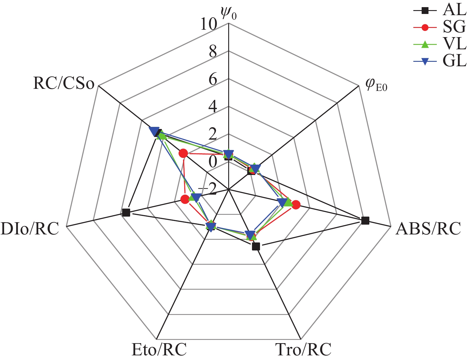 如图8所示:在能量传递效率方面,捕获的光量子进入电子传递的效率(Ψ0)和吸收的光能进入电子传递的效率(φE0)的趋势一致,均从大到小依次为AL、SG、VL、SG,且AL与其他叶片差异显著(P<0.05)。在单位反应中心的性能方面,不同叶片的反应中心吸收光能(ABS/RC)、PSⅡ的最大捕获量(TRO/RC)、用于电子传递的能量(ETO/RC)、单位反应中心的热耗散(DIO/RC)这4个代表单位反应中心的性能的参数趋势较为一致。ABS/RC从大到小依次为AL(8.13)、SG(2.97)、VL(2.38)、GL(1.96)。AL吸收的光能远远高于其他叶片,还原QA的能量及用于电子传递的能量最高。但是GL的单位面积反应中心(RC/CSO)的数量最多,SG的RC/CSO数量为最少。
