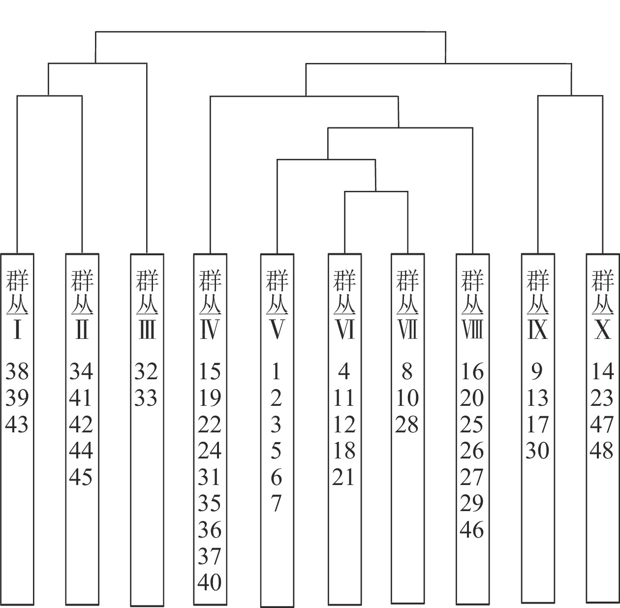 使用Wintwins 2.3软件,采用双向指示种分析分类方法,对由48个样方及样方内194个种的重要值组成的48×194维矩阵进行分析,得出数量分类结果。