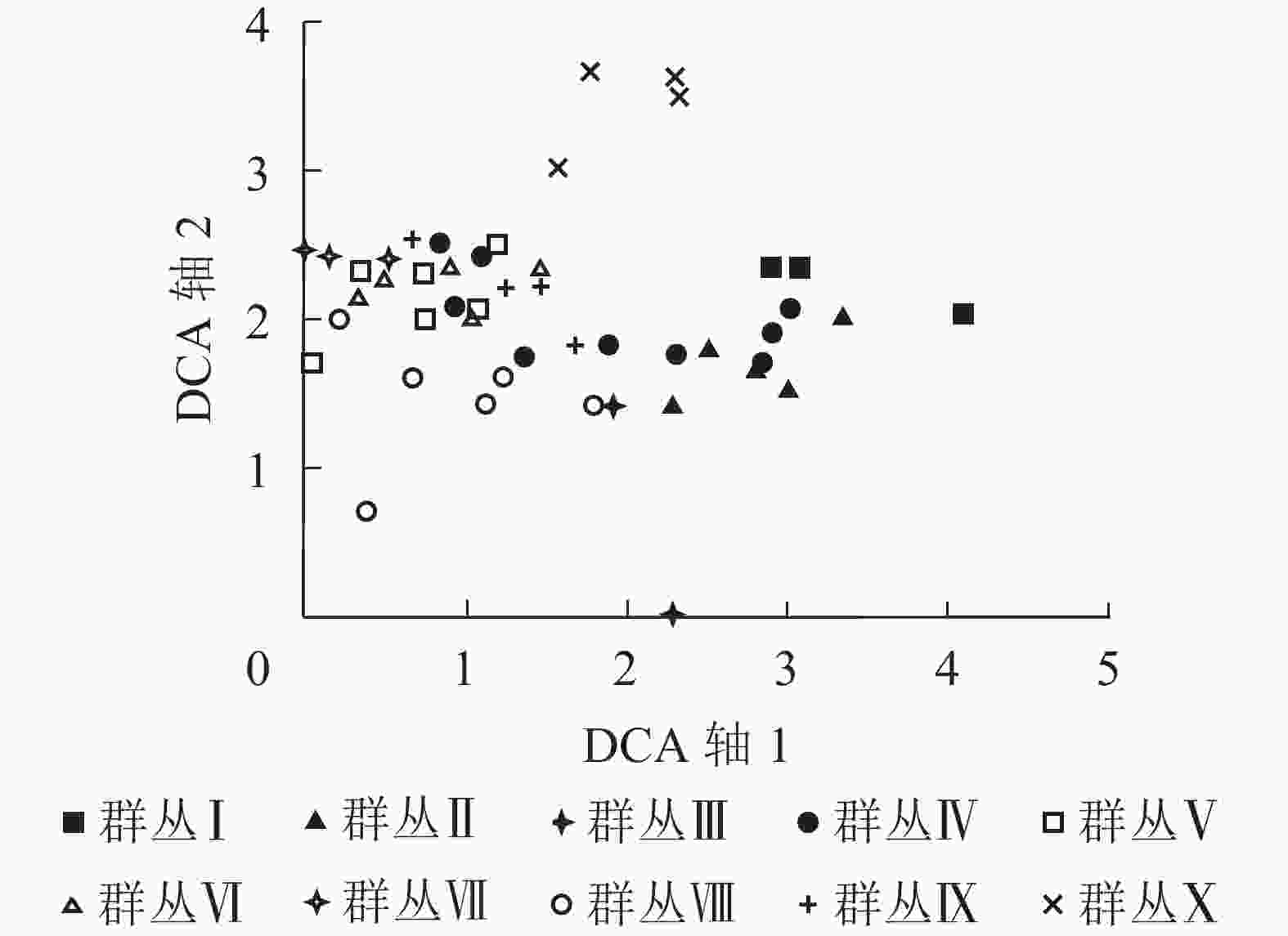 群丛 群丛名称 海拔/m 坡向 坡度/(°) 土壤类型 土壤温度/℃ 土壤湿度/% Ⅰ 黄山松-映山红-东方古柯-少花万寿竹群丛 1 200~1 500 北 10~30 黄壤 15~20 16~19 Ⅱ 黄山松-木荷-映山红-多花黄精群丛 1 200~1 400 西北、东北 25~35 黄壤 15~22 10~32 Ⅲ 甜槠-木荷-黄丹木姜子-少花万寿竹群丛 1 000~1 200 东 30~35 黄壤 24~25 12~16 Ⅳ 杉木-毛花连蕊茶-江南卷柏群丛 600~1 300 东、西 10~30 红壤、黄壤 17~25 25~52 Ⅴ 杉木-木荷-杜茎山-芒萁群丛 500~800 东北、东南 20~30 红壤 17~22 18~61 Ⅵ 青冈-木荷-细枝柃-黑足鳞毛蕨群丛 500~800 东、东南 10~30 红壤 18~26 18~28 Ⅶ 拟赤杨-虎皮楠-山矾-日本蛇根草群丛 500~800 东 25~30 红壤 19~23 19~40 Ⅷ 刨花楠-隔药柃-蕨群丛 500~900 东南、南 25~45 红壤 20~23 15~52 Ⅸ 马尾松-木荷-草珊瑚-中华薹草群丛 500~900 西 10~30 红壤 20~24 16~39 Ⅹ 毛竹-山鸡椒-地菍群丛 500~800 西南、西 5~25 红壤 21~25 23~42 表 4浙江庆元巾子峰国家森林公园植被群落的典范对应分析排序