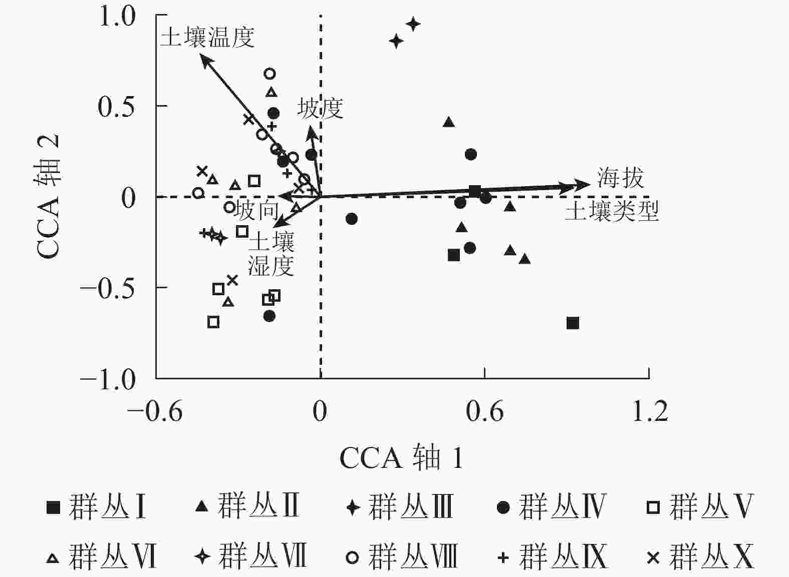 数据累计贡献率/%第1排序轴 −0.171 −0.432* −0.038 −0.154 0.962** 0.906** 0.497 0.975 7.3 38.0 第2排序轴 −0.152 −0.699** 0.352* 0.003 0.059 0.044 0.224 0.885 10.6 55.2 第3排序轴 −0.068 0.226 −0.506 0.347* −0.015 0.152 0.184 0.818 13.3 69.2 第4排序轴 0.661** 0.140 −0.304* 0.240 −0.022 −0.163 0.160 0.839 15.7 81.5 说明:**P<0.01, *P<0.05。所有典范轴的显著性监测F=1.629,P=0.002 样方-环境因子的典范对应分析排序图较为直观地呈现了植被群落各群丛类型分布与环境因子的关系(图3),带箭头射线代表环境因子,射线长度表示植被群落与环境因子相关性的大小,射线所在象限表示环境因子与排序轴相关性的正负。典范对应分析排序第1轴代表了海拔和土壤类型,从左往右海拔逐渐升高,土壤由红壤转变为黄壤;第2排序轴代表了土壤温度,从下往上土壤温度逐渐增加。群丛Ⅰ和群丛Ⅱ的分布与海拔和土壤类型关系比较密切,分布在海拔最高的区域,且均是黄壤。群丛Ⅲ分布在较高海拔。群丛Ⅳ分布比较宽泛,在海拔600~1 300 m均有分布,土壤有红壤还有黄壤。群丛Ⅴ和群丛Ⅶ与土壤湿度关系较密切。群丛Ⅷ、群丛Ⅸ和群丛Ⅹ则与土壤温度和土壤湿度关系密切。