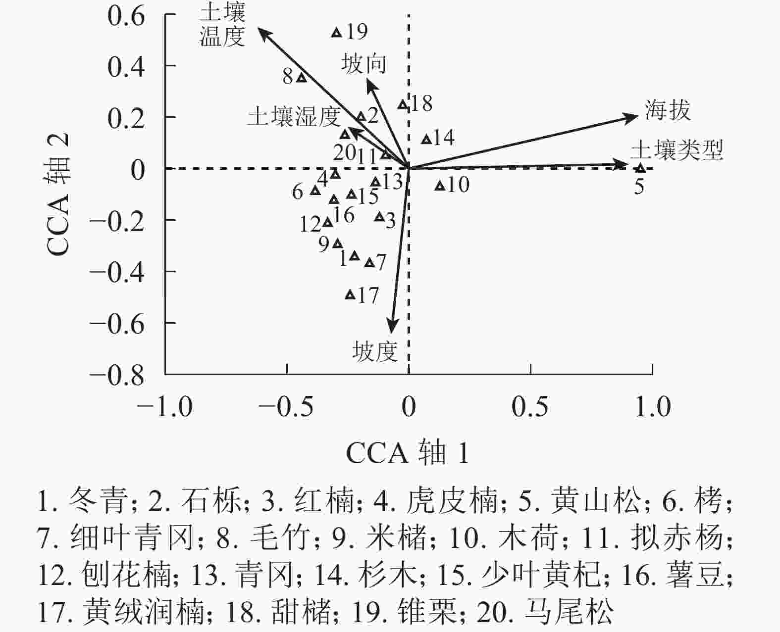 优势乔木树种对群落结构和群落环境的形成有明显控制作用,个体数量不一定很多,但却能决定群落结构和内部环境条件,是植被群落的建造者。对森林群落中20个优势乔木树种进行典范对应分析排序,排序结果如图4所示。海拔、土壤类型、土壤湿度和坡度对物种分布起决定作用。黄山松分布在中山带阴坡,土壤类型为黄壤,位于排序图的右方。甜槠、锥栗分布在低山半阳坡,土壤类型为黄壤,位于排序图的上方。杉木分布在低山、中山带半阳坡、半阴坡,土壤类型为红壤或黄壤,位于排序图的中间靠上位置。青冈、木荷分布在低山、中山带半阳坡、半阴坡,土壤类型为红壤或黄壤,位于排序图的中间靠下位置。拟赤杨、石栎分布在低山半阳坡,土壤类型为红壤,位于排序图的中间靠左位置。马尾松分布在低山半阳坡,土壤类型为红壤,位于排序图的左方。刨花楠、虎皮楠、栲、米槠、红楠、冬青、薯豆、少叶黄杞、细叶青冈、黄绒润楠分布在低山半阳坡、半阴坡,土壤类型为红壤,位于排序图的左下方。毛竹分布在低山阳坡,土壤类型为红壤,位于排序图的左上方。