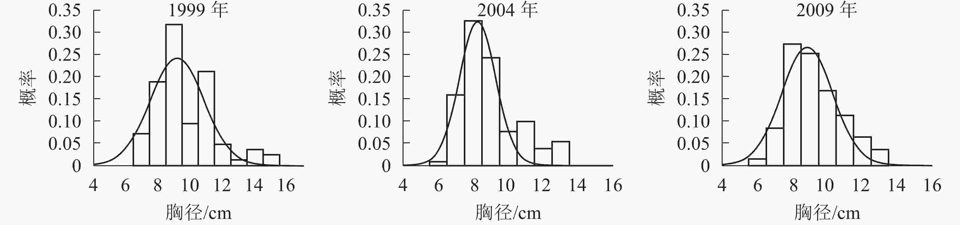 年份 函数模型 R2 顶点胸径值/cm 1999 ${ y = 0.241\;2{{\rm{e}}^{ - {{\left( {\tfrac{{x - 9.183}}{{2.355}}} \right)}^2}}}}$ 0.666 0* 9.183 2004 ${y = 0.324\;3{{\rm{e}}^{ - {{\left( {\tfrac{{x - 8.264}}{{1.495}}} \right)}^2}}}}$ 0.850 5** 8.264 2009 ${y = 0.266\;0{ {\rm{e} }^{ - { {\left( {\tfrac{ {x - 8.880} }{ {2.068} } } \right)}^2} } } }$ 0.880 7** 8.880 说明:*P<0.05;**P<0.01。y表示概率,x表示胸径 由图1和表2可知:随着针阔混交林的生长发育,各时期的胸径分布形态均呈近似正态分布,高斯分布模型的顶点胸径值先减小后增大。在95%的置信区间里,1999年的胸径为[6.22,12.13] cm,2004年的胸径为[6.21,10.31] cm,2009年的胸径为[6.21,11.55] cm。各时期胸径范围区间上限和区间的范围都出现了先减小后增大的趋势,说明1999−2009年针阔混交林的胸径范围和范围上限都是先减小后增大,胸径范围下限基本不变。