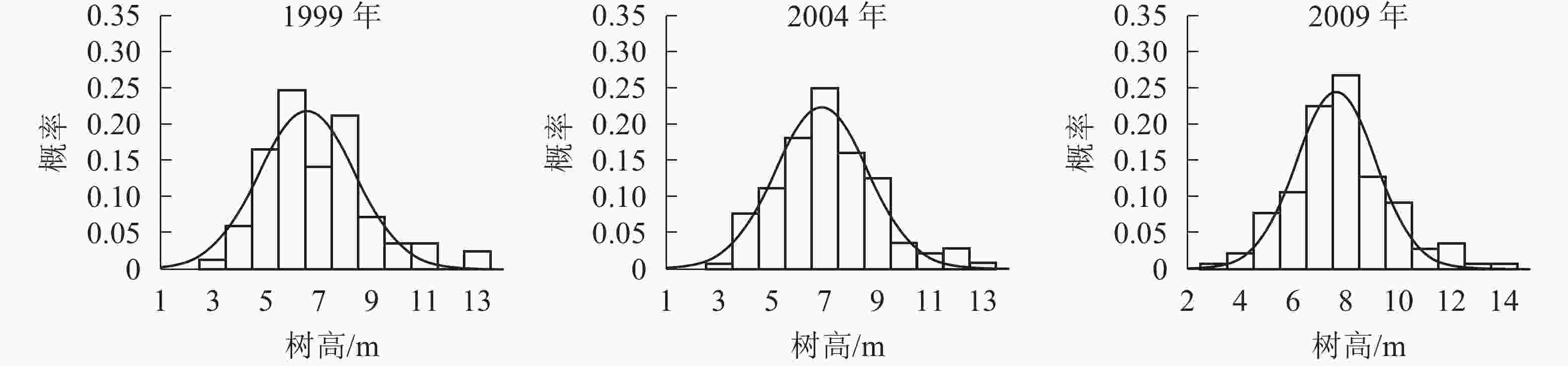 年份 函数模型 R2 顶点胸径值/cm 1999 ${ y = 0.241\;2{{\rm{e}}^{ - {{\left( {\tfrac{{x - 9.183}}{{2.355}}} \right)}^2}}}}$ 0.666 0* 9.183 2004 ${y = 0.324\;3{{\rm{e}}^{ - {{\left( {\tfrac{{x - 8.264}}{{1.495}}} \right)}^2}}}}$ 0.850 5** 8.264 2009 ${y = 0.266\;0{ {\rm{e} }^{ - { {\left( {\tfrac{ {x - 8.880} }{ {2.068} } } \right)}^2} } } }$ 0.880 7** 8.880 说明:*P<0.05;**P<0.01。y表示概率,x表示胸径 表 3各时期树高分布最优拟合函数模型表
