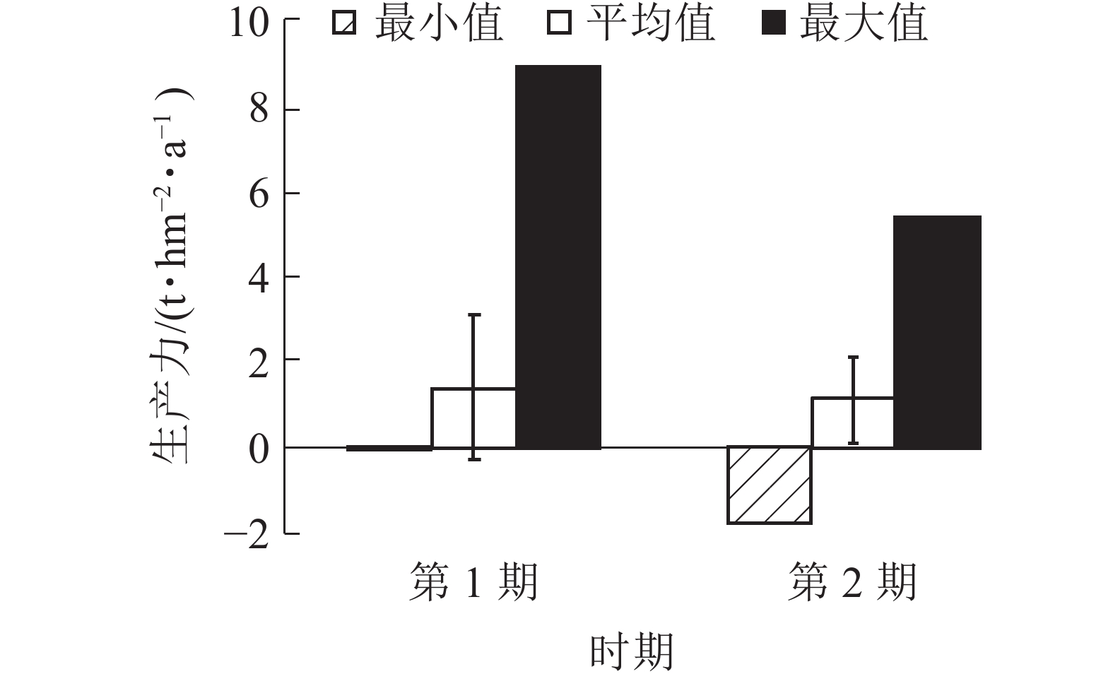 由图5可知:2期生产力均为负值,分别为−0.08和−0.19 t·hm−2·a−1。平均生产力从第1期(1999~2004年)的1.39 t·hm−2·a−1降低到第2期(2004~2009年)的1.15 t·hm−2·a−1。生产力最大值也从第1期(1999~2004年)的8.89 t·hm−2·a−1降低到第2期(2004~2009年)的5.37 t·hm−2·a−1,说明1999−2009年生产力呈下降趋势。平均生产力与生产力最大值差值较大,生产力存在较大的提高空间。
