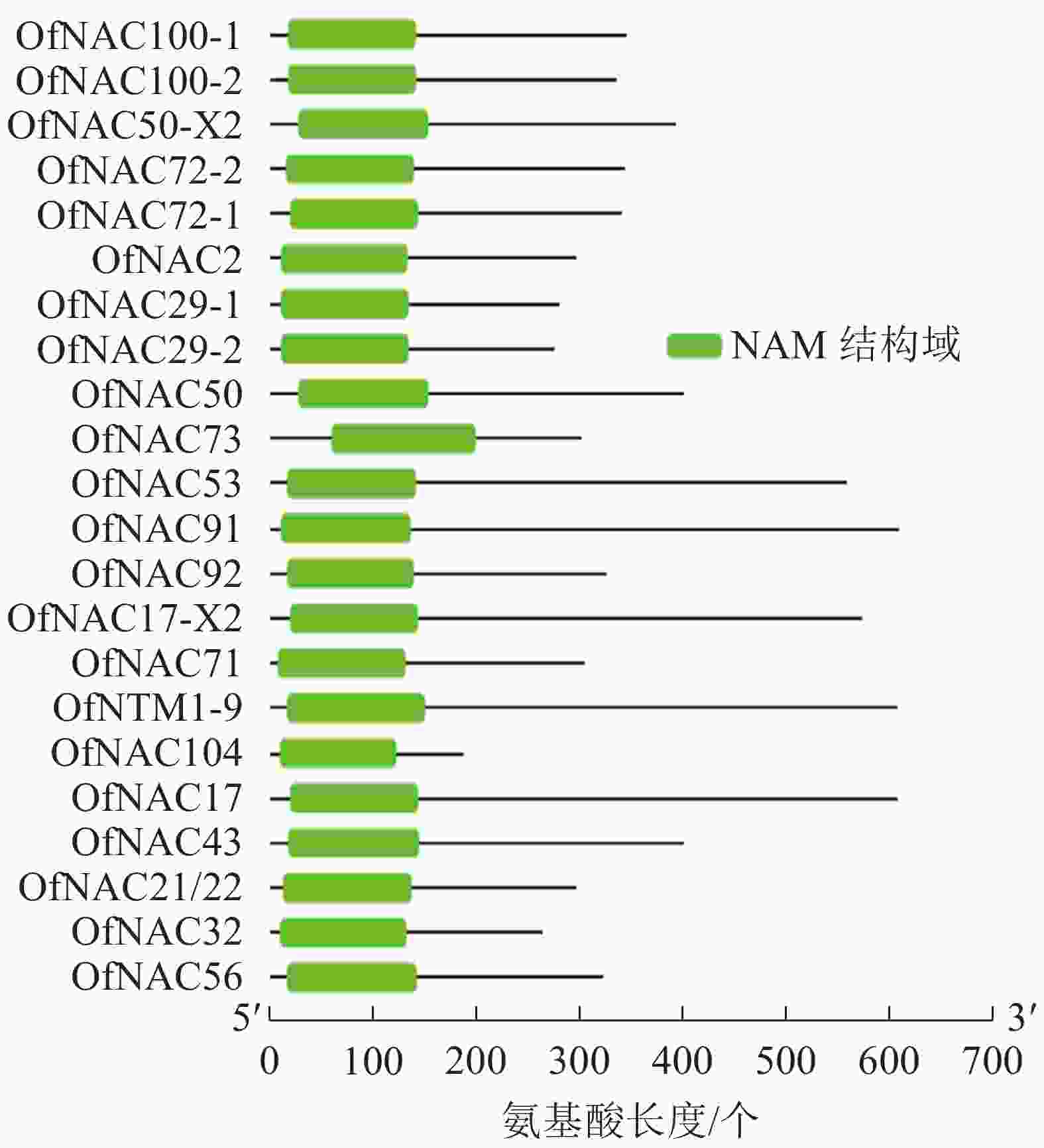 NAC转录因子最初在矮牵牛Petunia hybrida中发现[21]。在模式植物拟南芥、水稻以及园艺作物中的研究较多。在拟南芥、水稻、黄瓜Cucumis sativus、紫花苜蓿Medicago sativa中分别有151、117、91、113个NAC基因被鉴定[22-24]。目前关于桂花OfNAC转录因子的报道较少。通过桂花OfNAC转录因子的鉴定与分析,可为进一步了解桂花OfNAC的生物学功能及其在花开放过程中的作用奠定基础。