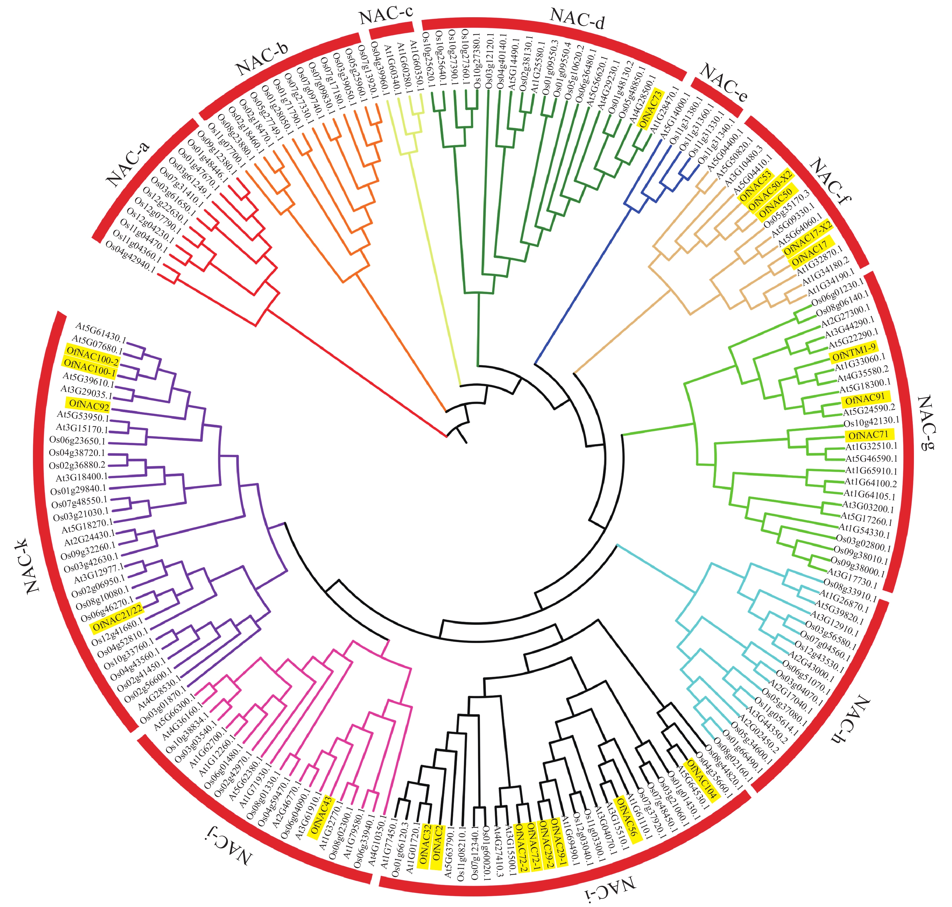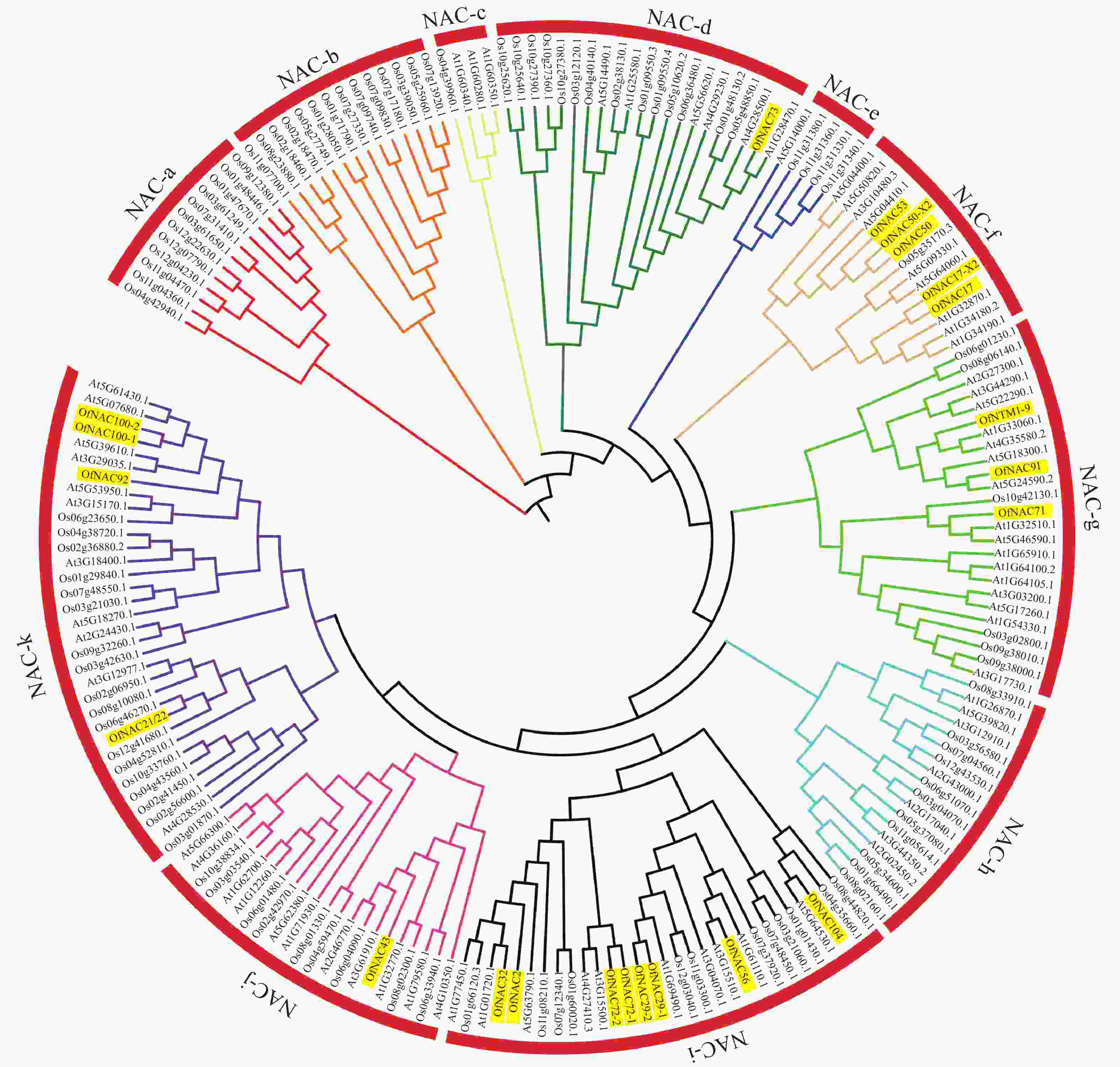 为了进一步研究OfNAC的进化关系,对桂花、拟南芥和水稻的NAC蛋白构建系统进化树。结果表明:22个桂花OfNAC与拟南芥和水稻的NAC蛋白质共划分为11个亚族(图5),除a、b、c、e、h亚族外,其他亚族均有OfNAC分布。其中i亚族桂花NAC蛋白质较多,有8个OfNAC蛋白质。