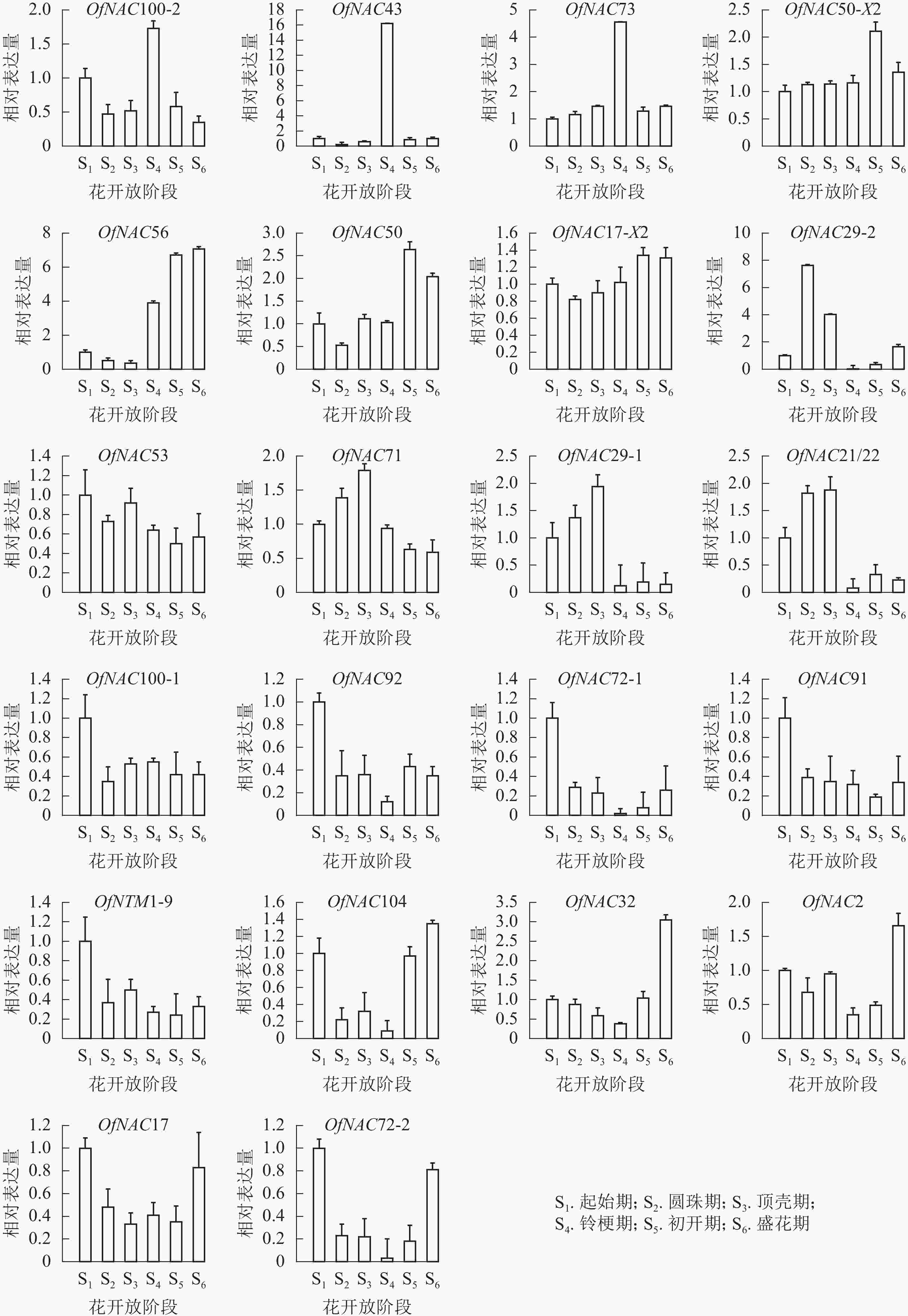 为了研究OfNAC在桂花花开放进程中的表达模式,对其进行荧光定量表达分析(图6)。OfNAC100-2、OfNAC43、OfNAC73相对表达量在铃梗期(S4)出现表达高峰,在此之后相对表达量大幅度降低,其中OfNAC43只在铃梗期(S4)相对表达量最高,其余时期相对表达量很低;OfNAC56从铃梗期开始呈现上升趋势,并在盛花期(S6)到达顶峰;OfNAC71、OfNAC29-1、OfNAC21/22从起始期(S1)缓慢上升,在顶壳期 (S3)到达最高,随后急剧下降;OfNAC29-2在圆珠期(S2)相对表达量达到最大,之后在铃梗期(S4)相对表达达到最低。OfNAC在花开放不同阶段的表达情况说明:OfNAC100-2、OfNAC43、OfNAC73、OfNAC71、OfNAC29-1、OfNAC21/22、OfNAC29-2可能参与花开放的调控,其中又以OfNAC43和OfNAC29-2关联最为紧密。