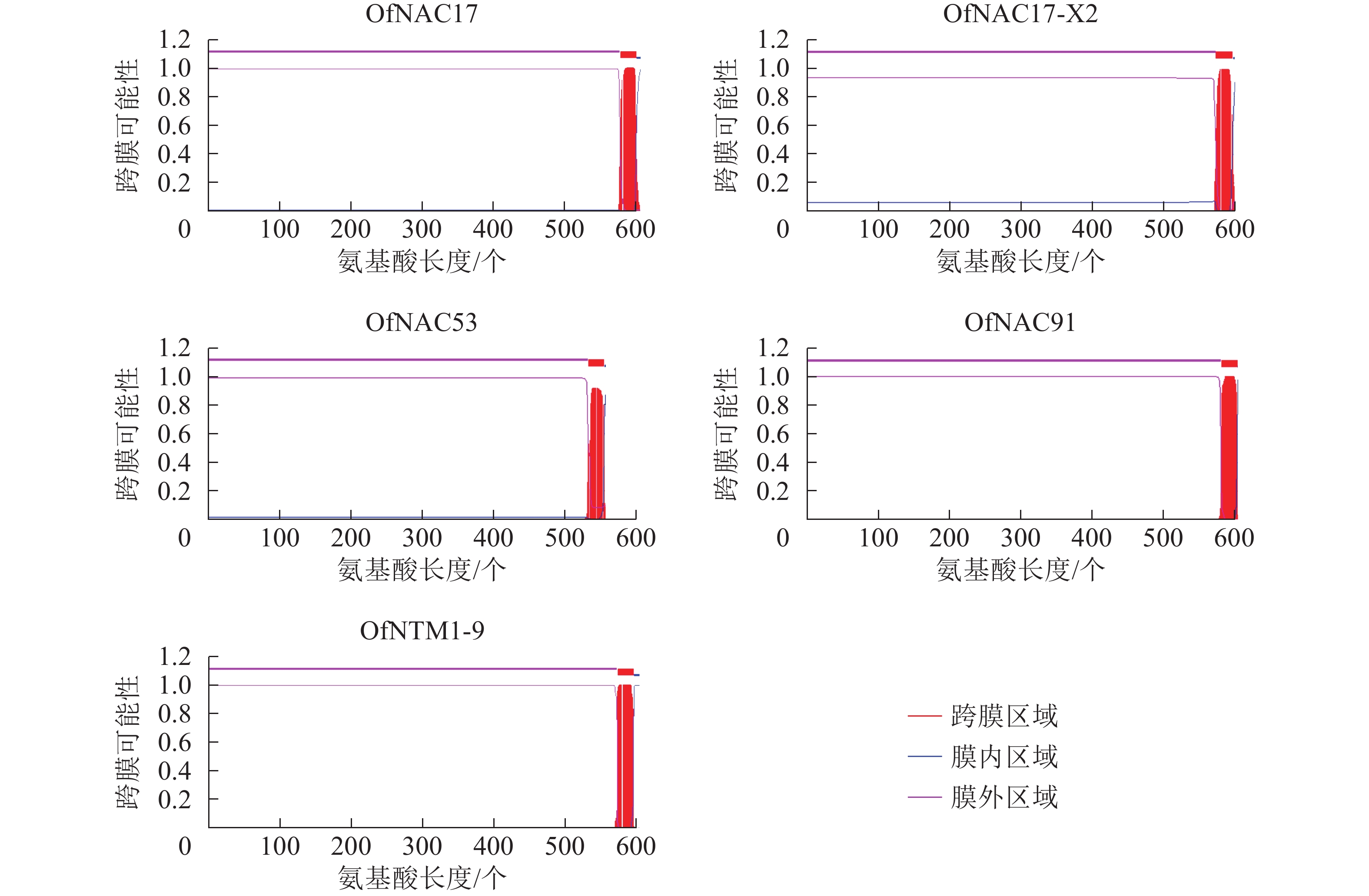 本研究通过转录组测序鉴定出22条开放阅读框完整的OfNAC转录因子,对它们进行跨膜结构预测发现:OfNAC17、OfNAC17-X2、OfNAC53、OfNAC91、OfNTM1-9这5个转录因子均在C端有1个跨膜结构,推测它们可能是NAC膜结合转录因子。大多数OfNAC蛋白质预测定位在细胞核中的可能性较高,因此推测,OfNAC转录因子可能大多依旧在细胞核内发挥功能。目前,已经在模式植物中发现NAC膜结合转录因子,如拟南芥和水稻NAC基因组中已发现分别有18和6个膜结合NAC转录因子[25-26],其中拟南芥膜结合转录因子NTM1调节细胞分裂素信号传导而参与细胞分裂;NTL8调节拟南芥开花时间,过表达转基因植株出现晚花现象;ANAC089被确定为另一个膜结合转录因子,也有调控拟南芥开花时间的功能[27-28]。由此推测,桂花OfNAC17、OfNAC17-X2、OfNAC53、OfNAC91、OfNTM1-9可能也具有调控开花时间的功能。