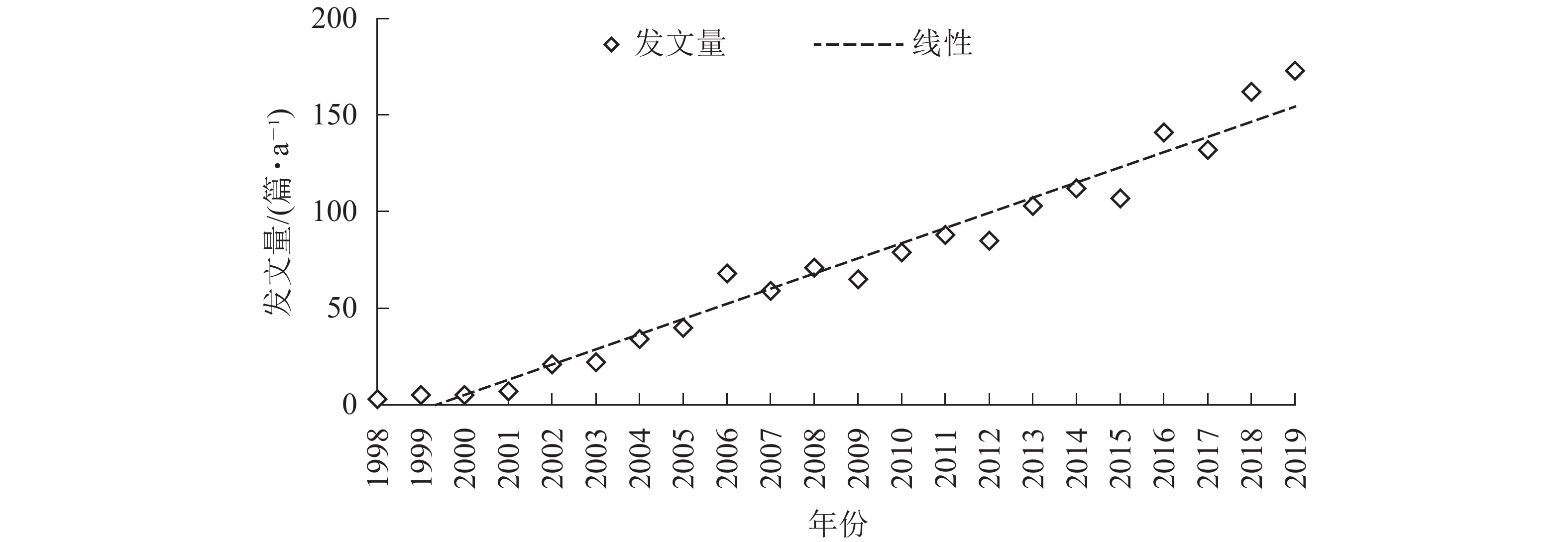 • 图1可知:1998−2019年间,竹林碳汇研究领域发文量约75篇·a−1,2001年后发文量大幅度增加,2013年后超过100篇·a−1,且具有明显的逐年增长态势。说明《京都议定书》签订后,通过竹林增汇应对气候变化问题引起了学术界的普遍关注;相关主题经过3~5 a的酝酿,以文献的形式快速积累并逐年增多;随着进入该领域的机构和作者增多,竹林碳汇研究进一步蓬勃发展。1998−2019年间年度发文数量有所波动,但总体趋势逐年上升并有加速增长态势,目前处于快速发展期。表明竹林碳汇的研究正受到越来越多学者的广泛重视。