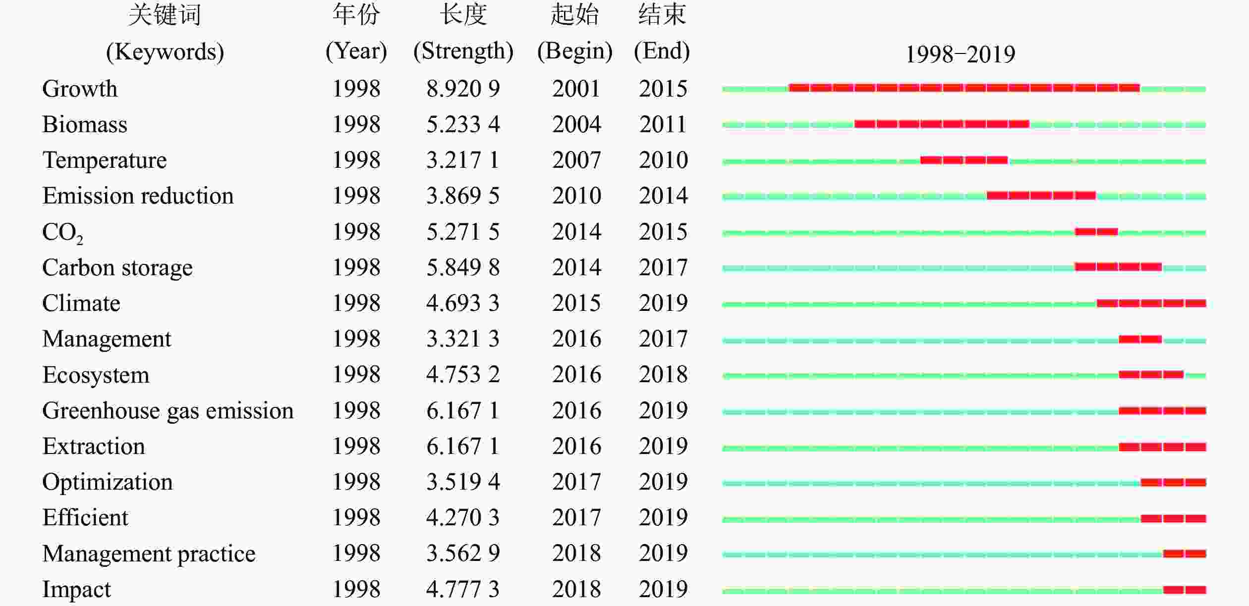 • 为探索不同时期竹林碳汇研究相关热点的变化情况,利用CiteSpace软件的突发检测功能对各期段的突发关键词进行归纳分析。由图2可知:自1998年以来,竹林碳汇领域突现了许多高频关键词,排名前15的突现高频关键词的突发变迁,与全球气候变化相关协议签订后,气候问题得到各国政府重视、森林碳汇在减排中的贡献凸显的时代背景息息相关,同时也体现了传统竹林经营比较收益下降背景下,学者们对通过竹林碳汇解决竹林持续经营问题的重视程度。