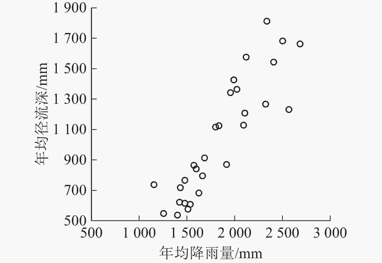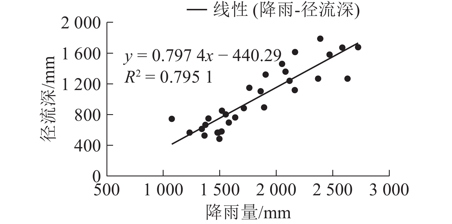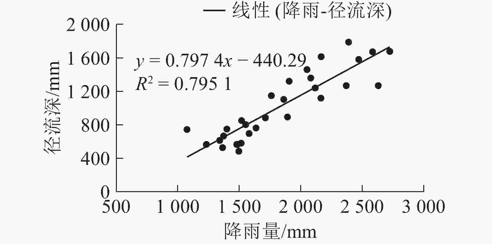 图1为石城县域多年降水量与径流深随时间的变化。从图1可以看出:在研究时段内,石城县域年降雨量和年径流深均呈正相关关系,即径流深随降雨量的增加而增加,相关系数R2为0.795 1。