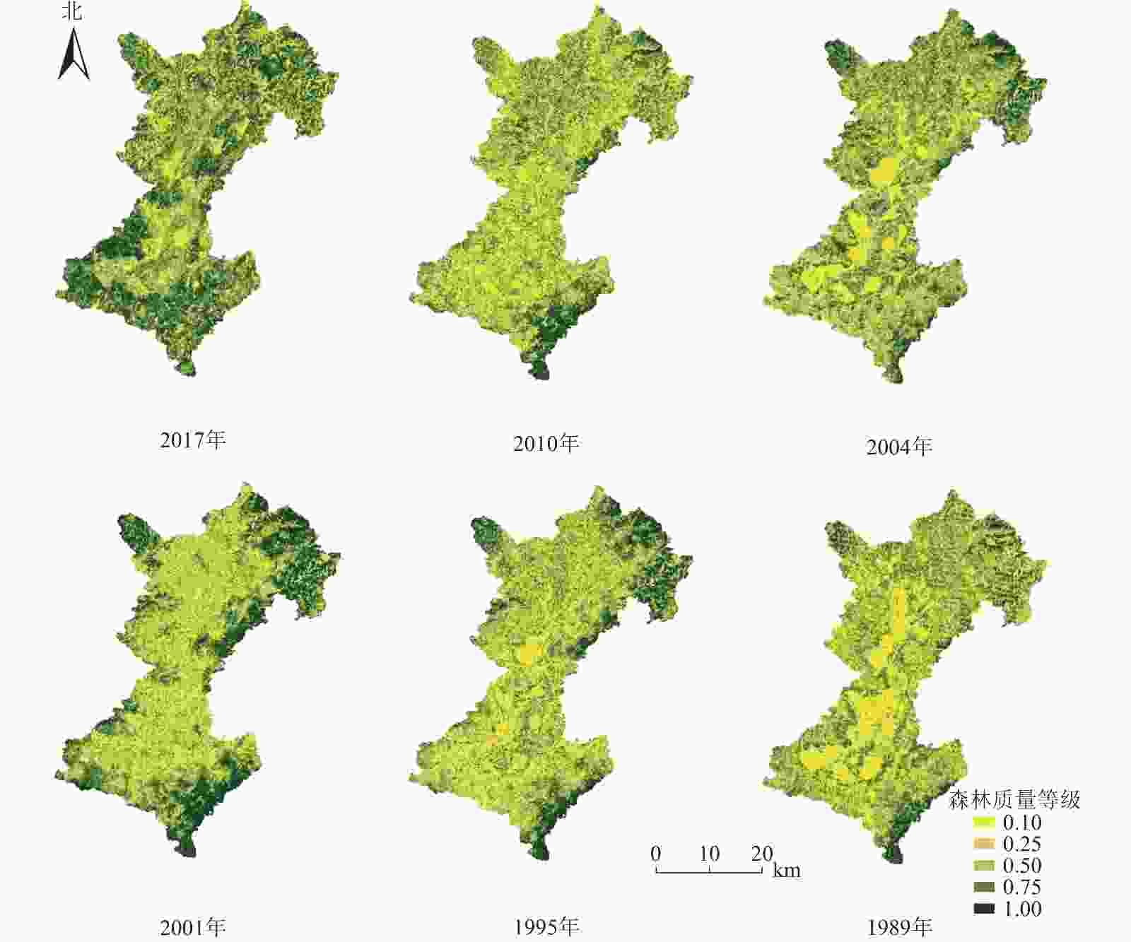 对石城县域1989、1995、2001、2004、2010和2017年6期遥感影像进行植被覆盖度计算,并根据森林质量等级因子值确定范围表提取得到石城县域的森林质量等级分布(图2)。