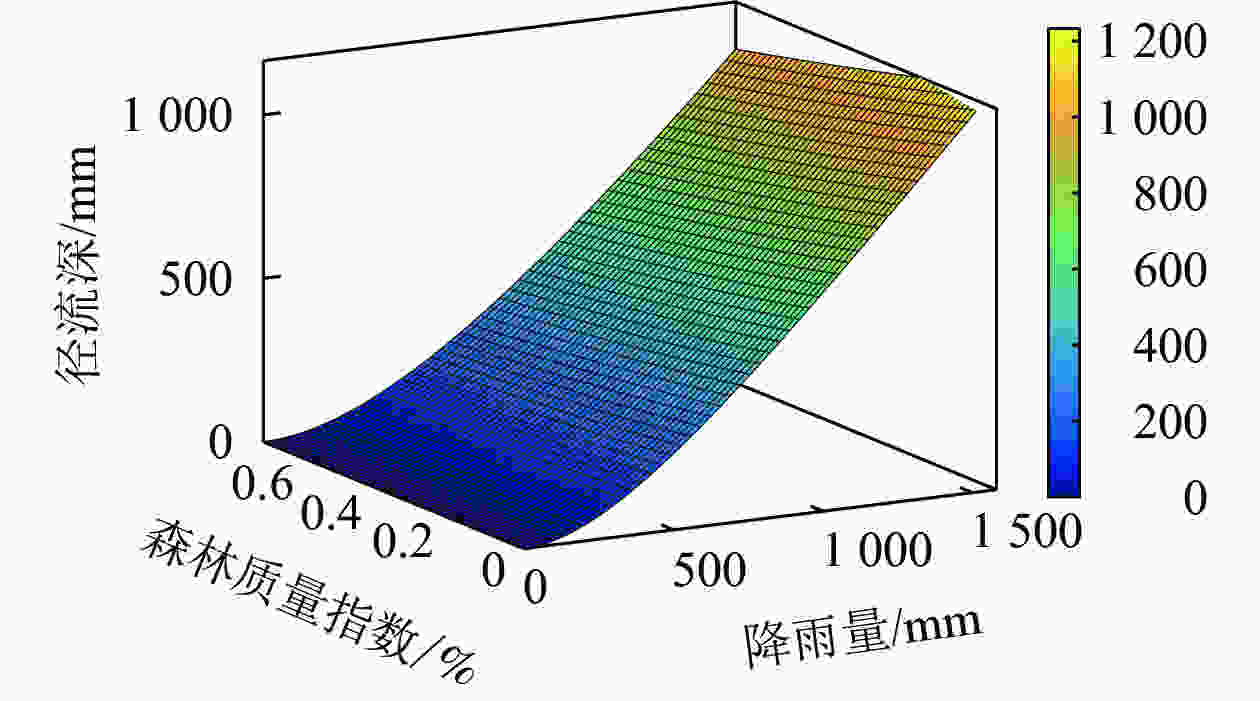 $$ Q\left(P,\;\beta \right)=P-\left(340.7\beta +351.8\right)\left[1-\mathrm{e}\mathrm{x}\mathrm{p}\left(\frac{-P}{340.7\beta +351.8}\right)\right]{\text{。}} $$ 其中:P为降雨量(mm);β为森林质量指数(%);Q为径流深(mm)。