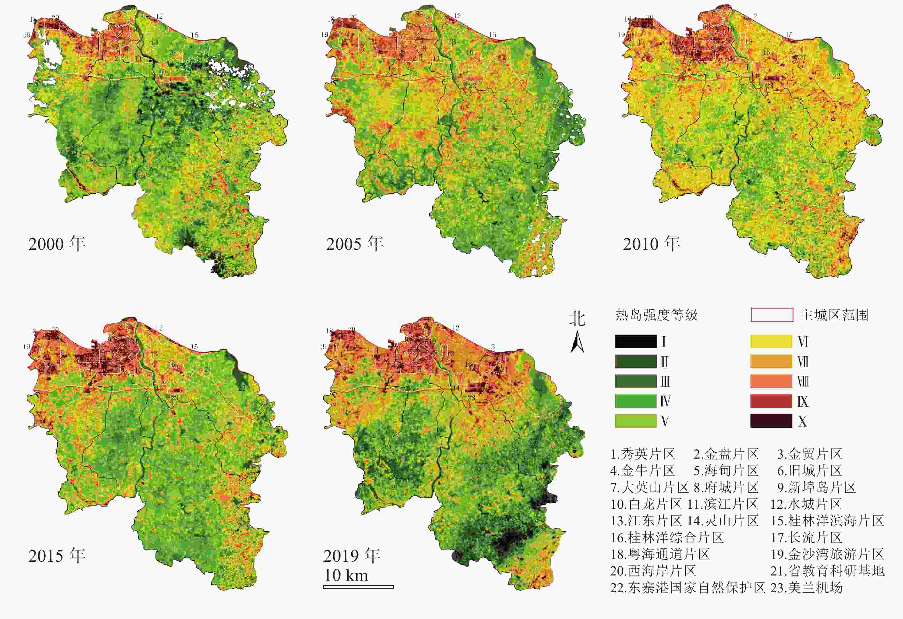 采用热场变异指数(heat index, HI)界定热岛强度[16],标准化处理后,对热环境景观的时空格局进行纵向比较与分析(图2)。计算公式为:IH=(Tn−Tmean)/Tmean。其中,IH表示相对地表温度,无量纲;Tn表示研究区域内第n点的地表温度;Tmean表示研究范围内的平均地表温度。根据武鹏飞等[17]研究,基于自然断点法划分10个热岛强度空间等级:Ⅰ表示极强冷岛,Ⅱ表示较强冷岛,Ⅲ表示中等冷岛,Ⅳ表示较弱冷岛,Ⅴ表示弱冷岛,Ⅵ表示弱热岛,Ⅶ表示较弱热岛,Ⅷ表示中等热岛,Ⅸ表示较强热岛,Ⅹ表示极强热岛。