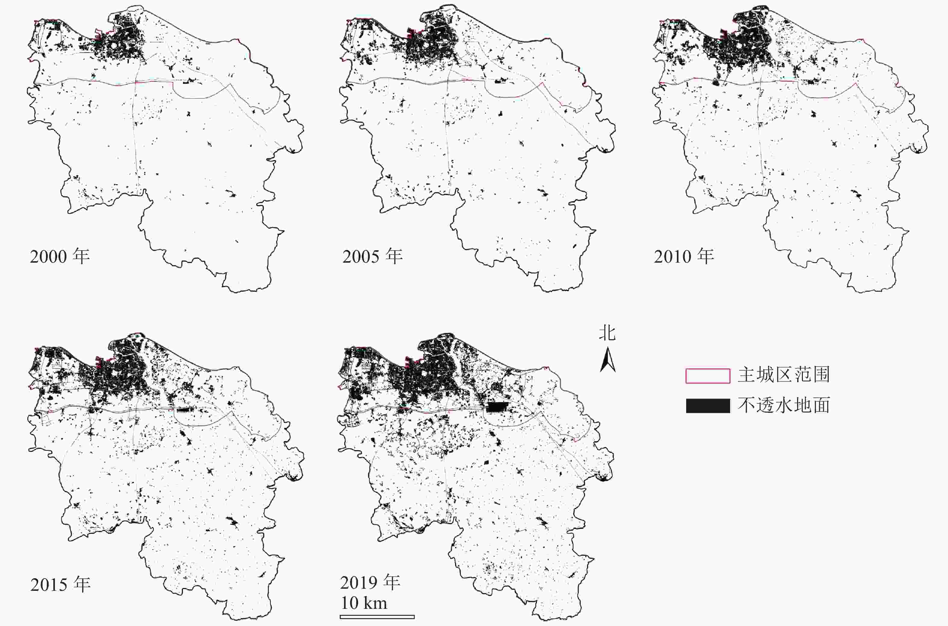综合热场变异指数空间分布(图2)与不透水面分布(图3)发现:5期热岛强度等级斑块主要与其城乡建设用地分布相吻合,集中在开发强度大的工商业集中区、人口密集区和部分裸地区域,热场变异指数以这些区域为核心向郊区不断降低,但5期热场变异指数等级内部有明显的时空差异。2000年热岛等级中心呈“单一连片中心主导,多中心散布”形式;“单一连片中心”分布于粤海通道、金沙湾和西海岸片区,是因这一区域正处于开发建设期;“多中心”于主城区主要在旧城、中心商务、水城和灵山片区、药谷和金盘工业园、狮子岭开发区及美兰机场,郊区主要在乡镇镇区和裸露河滩。2005年为“多中心散布”;主城区主要在粤海通道、金沙湾、西海岸、金贸、海甸、中心商务、水城和桂林洋滨海片区、药谷和金盘工业园,2000年的“单一连片中心”依然是高温集中区,但不再连结成片;郊区中心较2000年减少很多。2010年呈“单一中心主导,多次中心集中”及“多中心”的形式;“单一中心”指金沙湾和西海岸片区的高强度开发带;“多次中心”集中于中心城区的秀英、金盘片、大英山和府城片区,城建活动频繁且分布广致使裸地增多、热岛中心集中;“多中心”在主城区有新埠岛、水城、灵山和桂林洋综合片区,狮子岭开发区、火车南站下方的裸地、美兰机场和省教育科研基地,这些区域同样处于快速建设阶段,“多中心”在郊区分布同前。2015年呈“连片中心主导,多中心散布”形式;“连片中心”指中心城区主要片区都存在热岛中心,表明中心城区产热量大、散热不足;“多中心”在主城区有狮子岭开发区、水城片区及其西侧的开发用地、灵山、桂林洋综合片区、美兰机场,郊区主要是各集中居民点、裸露河滩,郊区绿地多、散热功能较城区更好,因而无大片极强热岛。2019年呈“主城区多中心集中,郊区多中心散布”的形式;“主城区多中心”指除灵山片区以外的主要功能区都有极端热岛分布,尤以江东新区极端热岛增长最为显著,其城建范围与速度增长均较快,形成新的热岛集中区,这与海口“东优”发展战略、国际自贸港建设的政策导向相吻合;“郊区多中心”指极端热岛与较集中的聚居点或高强度开发的地点相一致。综上,从2000到2019年热岛等级中心集中区呈“西海岸→建成区→江东新区”和“西海岸→西南老城方向”的转移态势,且不断向城乡交错带扩散,呈范围扩散、速度递增的趋势。极强热岛在郊区分散于主要镇区或者裸地,未形成规模。可见,主要热岛中心分布在主城区,与城镇扩张模式与城市发展阶段密切相关,“摊大饼”式的主城区扩张模式使得人口、建筑密集、城市绿化不足,导致自然散热条件差,因此形成极端热岛集中区;而卫星城镇的密集式开发,亦会形成小型热岛中心。